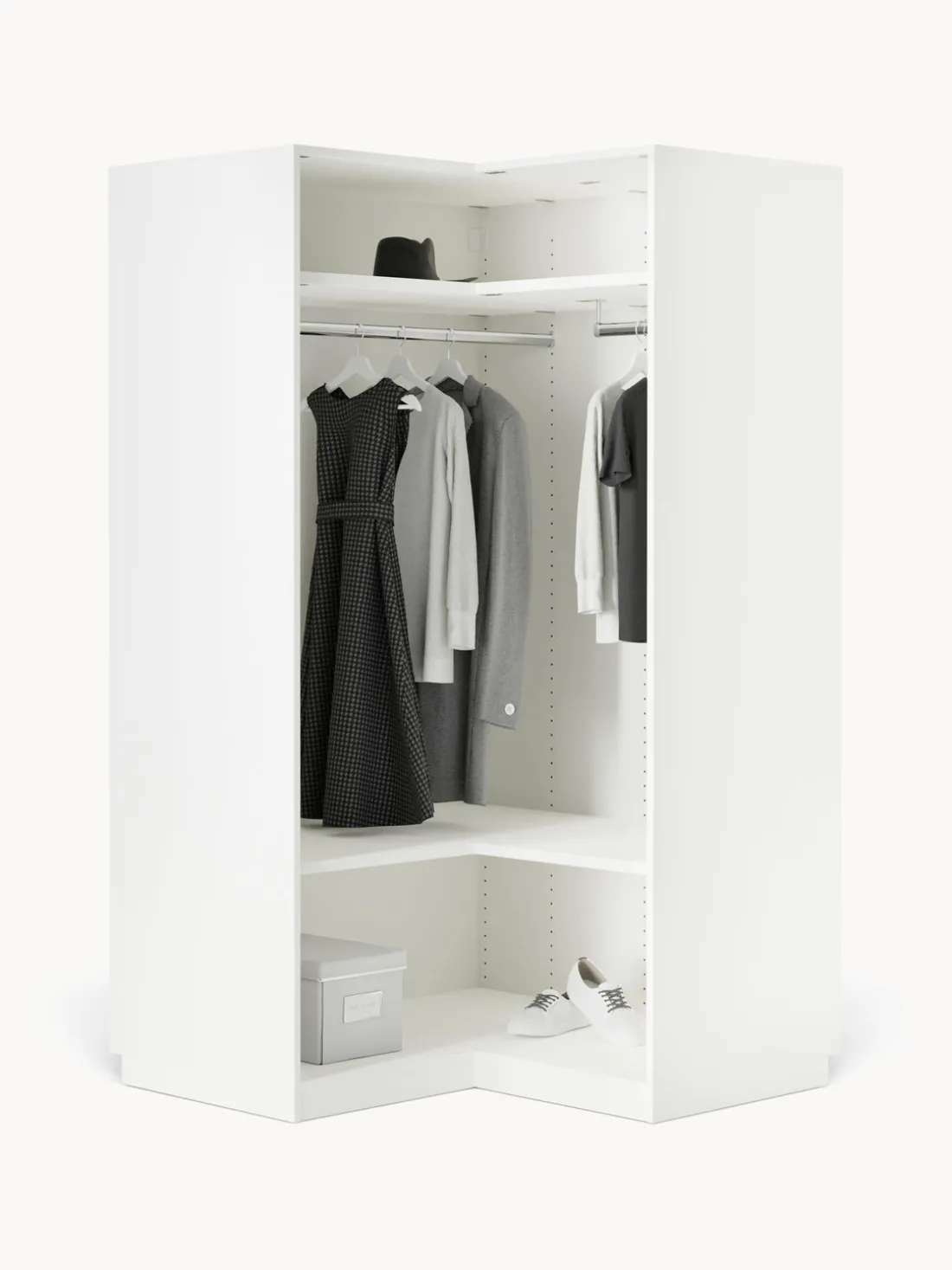 – El módulo esquinero incluye 2 barras para ropa, 2 estantes