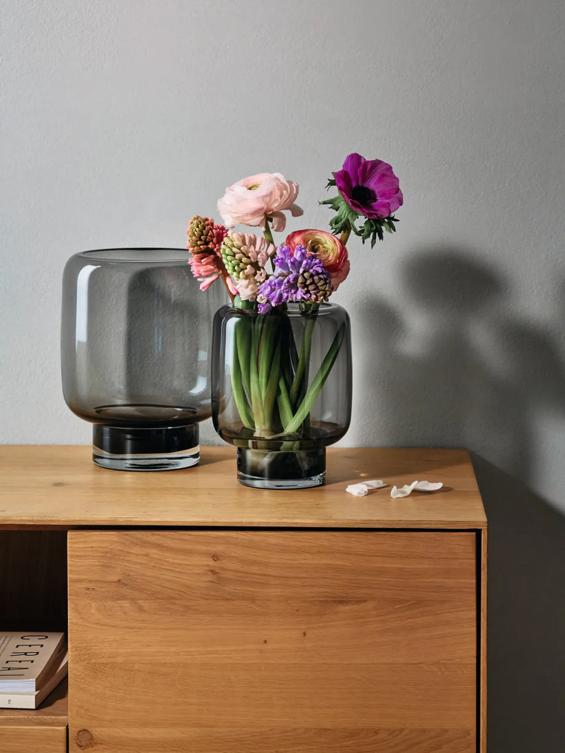 Un diseño, dos funciones: VEJLE es un portavelas y un jarrón a la vez, y un nuevo hogar para velas, candelabros o un ramo lleno de flores de primavera. El cristal ahumado con su diseño robusto se siente igualmente cómodo tanto en interiores como en exteriores.