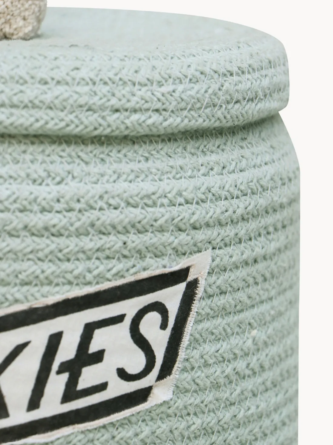 El sueño de tus peques: ¡una galleta llena de galletas! La cesta COOKIE JAR está hecha a mano con un cordón trenzado de fibras de botellas de PET recicladas mezcladas con algodón. La cesta tiene una etiqueta de tarro bordada con la palabra Cookies.