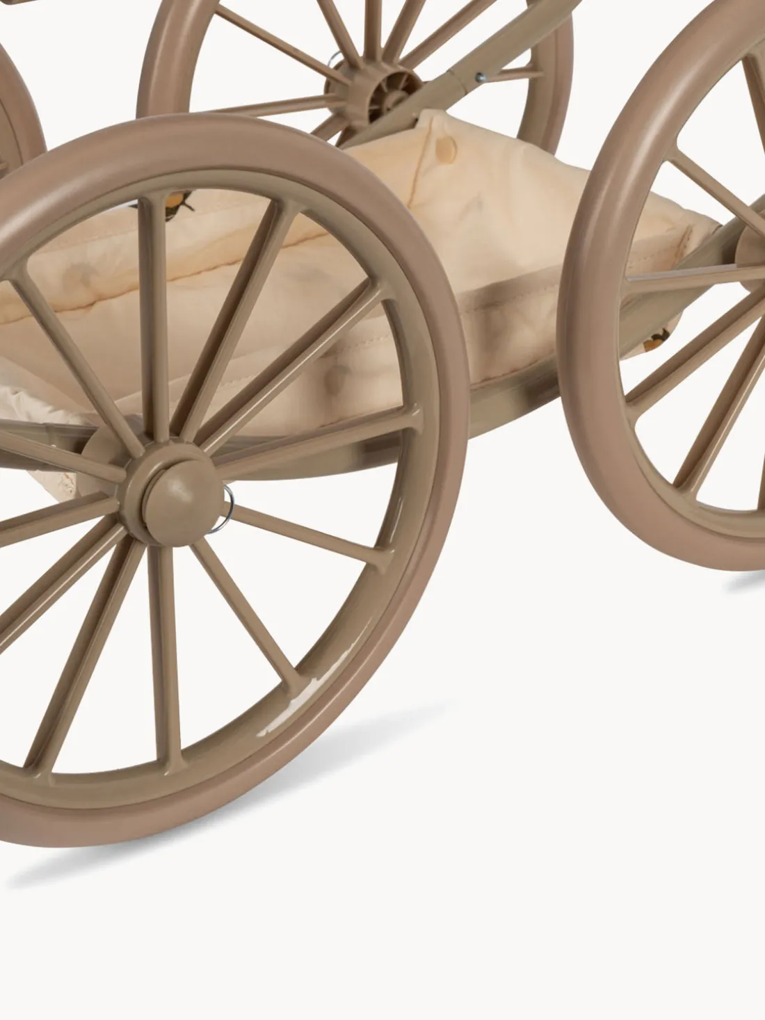 El cochecito de muñeca de estilo vintage en una versión más pequeña y fácil de manejar para los más peques. Diseñado con cuatro ruedas grandes que lo hacen fácil y estable de empujar, tejido acolchado y delicados bordes con ondas. El cochecito de muñeca incluye un capazo plegable y una cesta de almacenamiento acolchada debajo del asiento. El marco es de metal con empuñaduras de esponja suave. Viene completamente montado y es fácil de plegar y guardar.