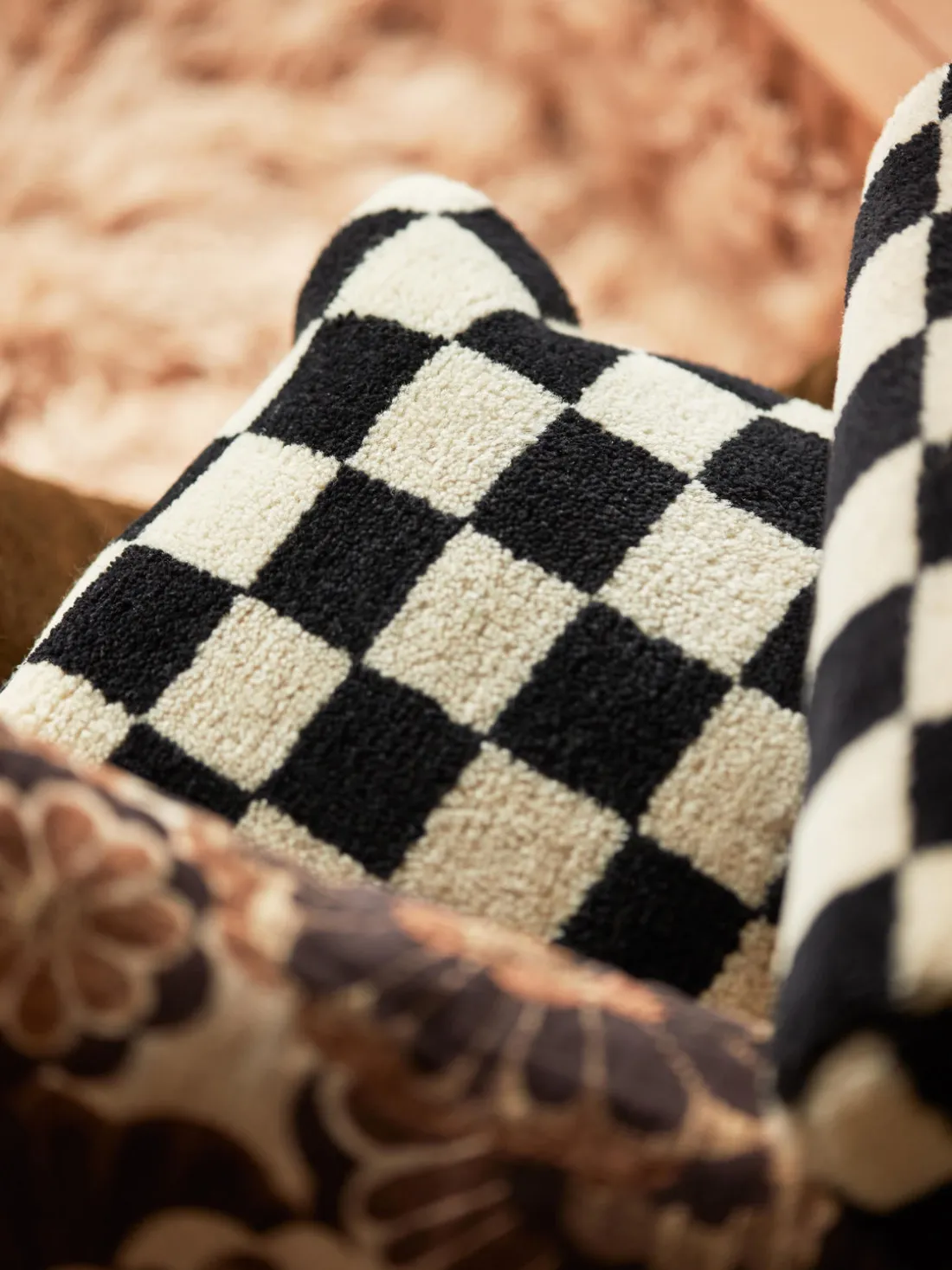 Además del moderno estampado de ajedrez, este cojín también será un complemento cómodo para tu sofá. Gracias a su composición de punto grueso de lana y suave algodón, es un cojín decorativo duradero.