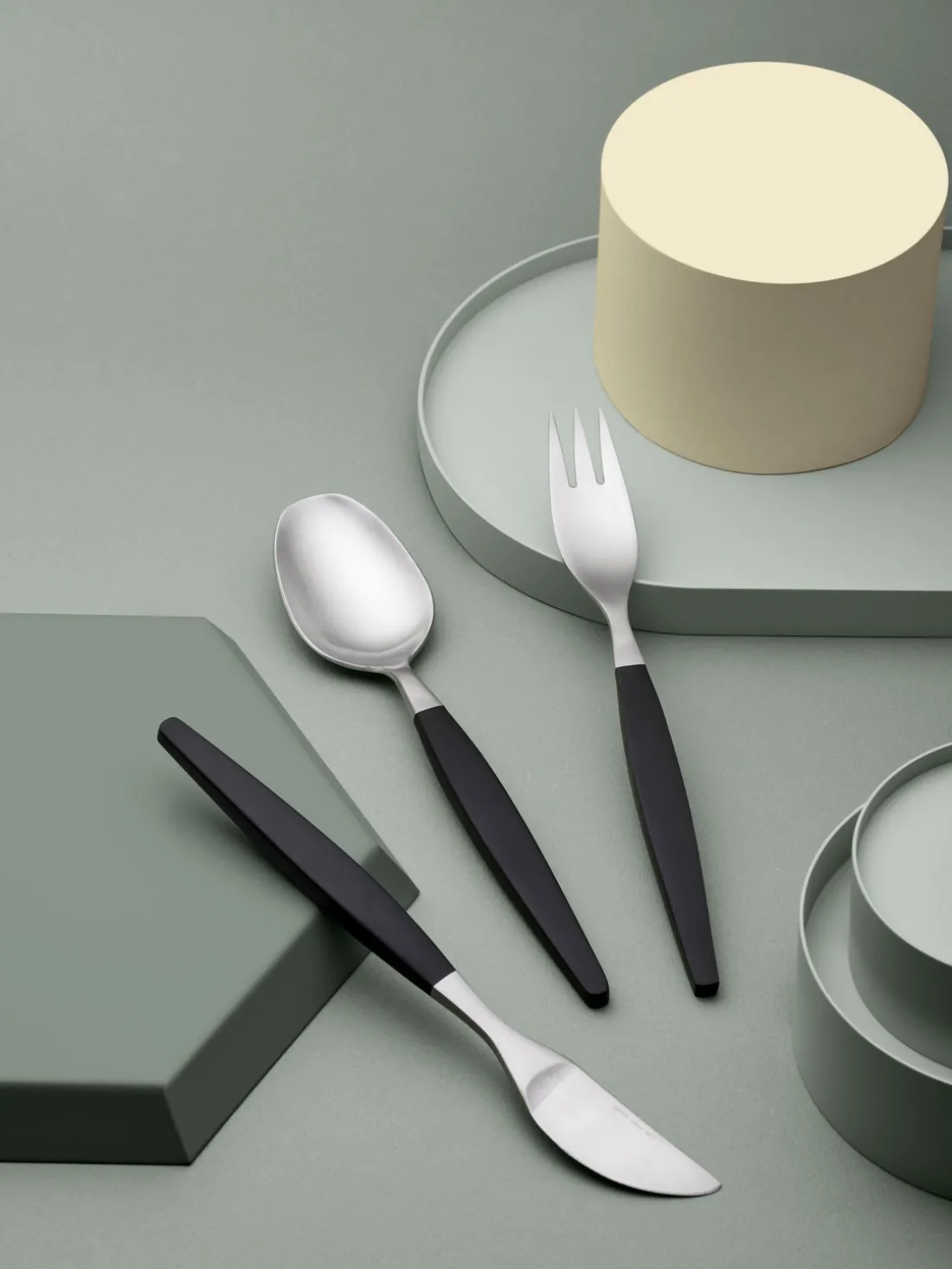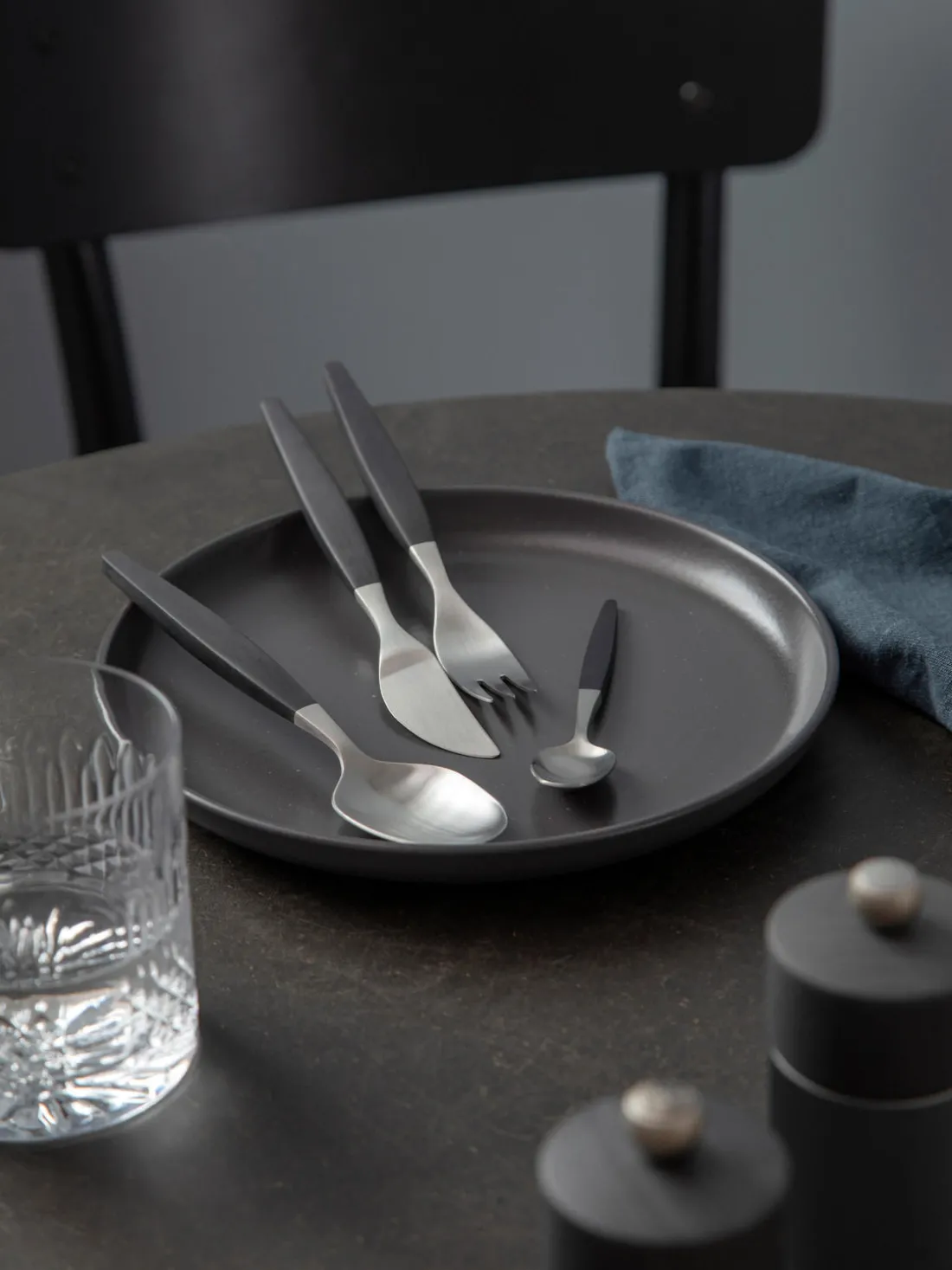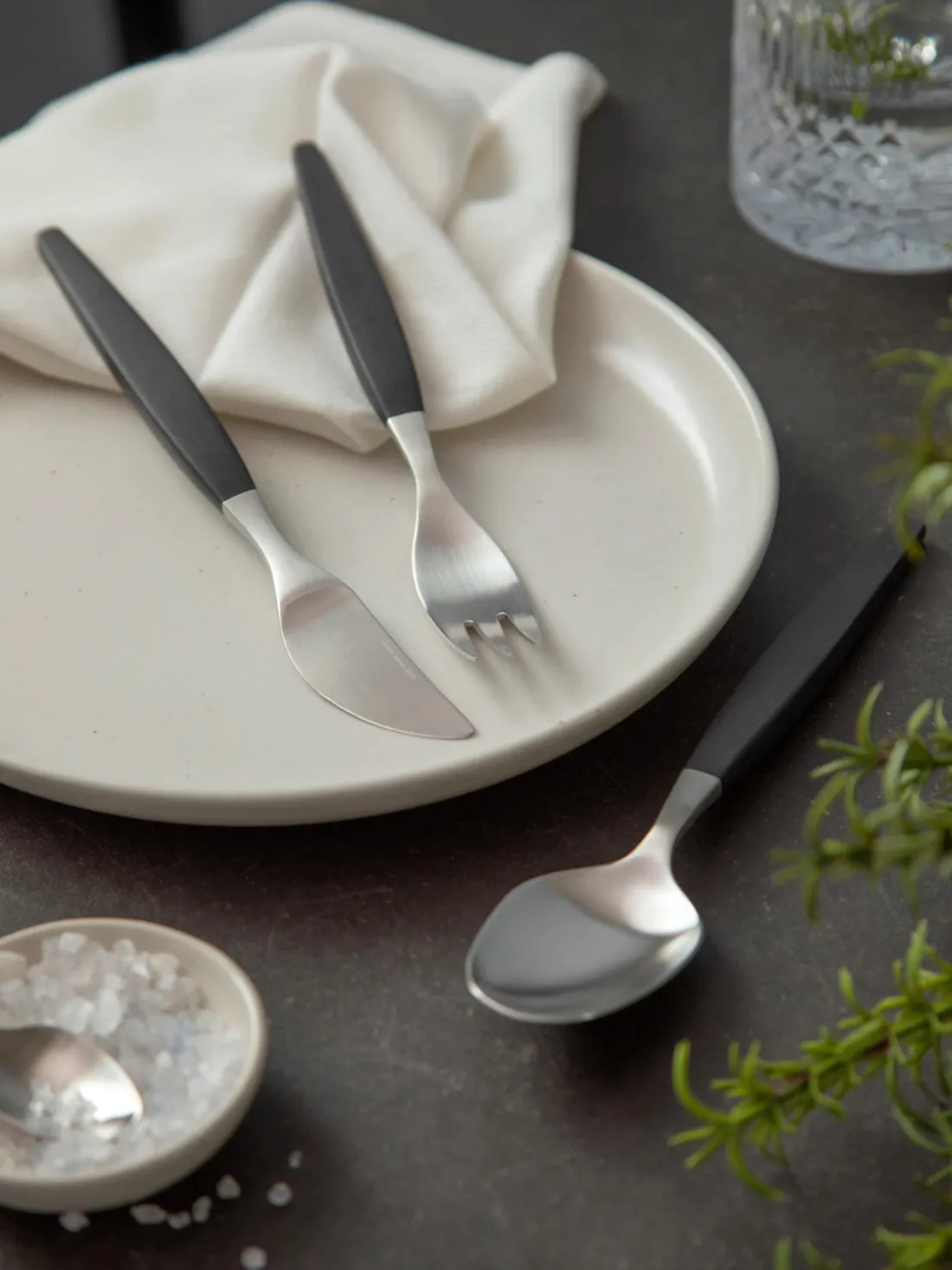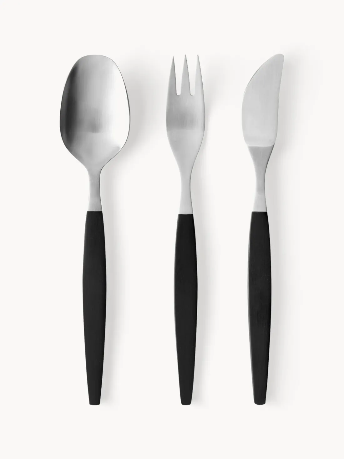 Este juego de cubiertos de 12 piezas con acabado cepillado mate consta de cuatro cuchillos, cuatro tenedores y cuatro cucharas.