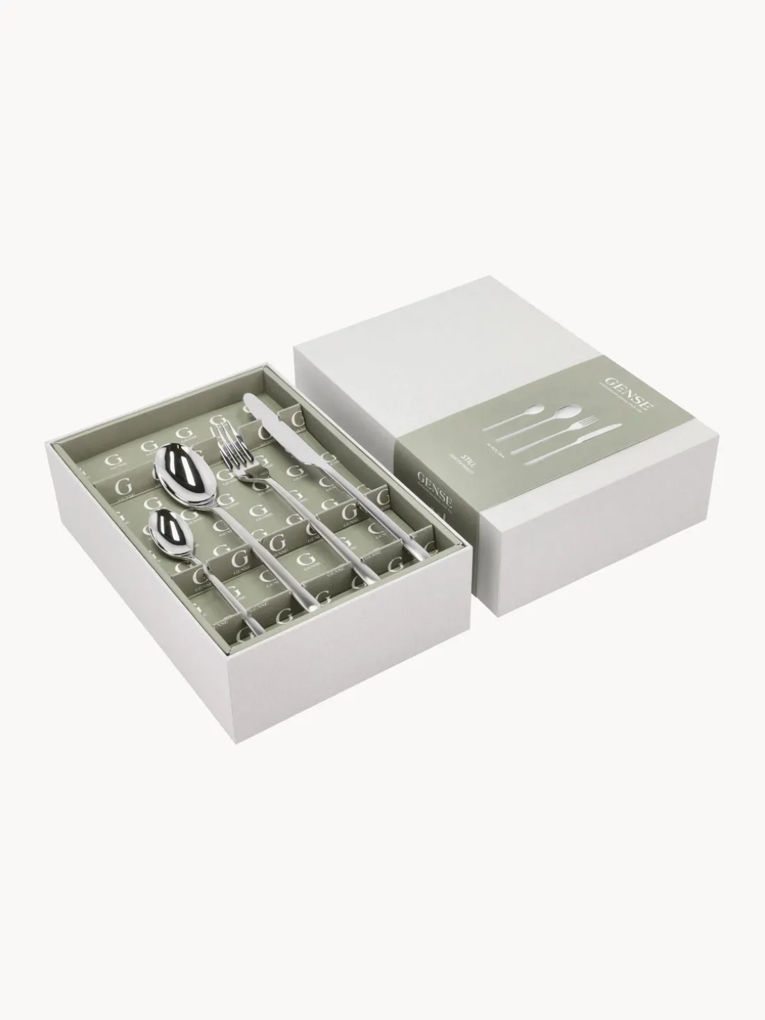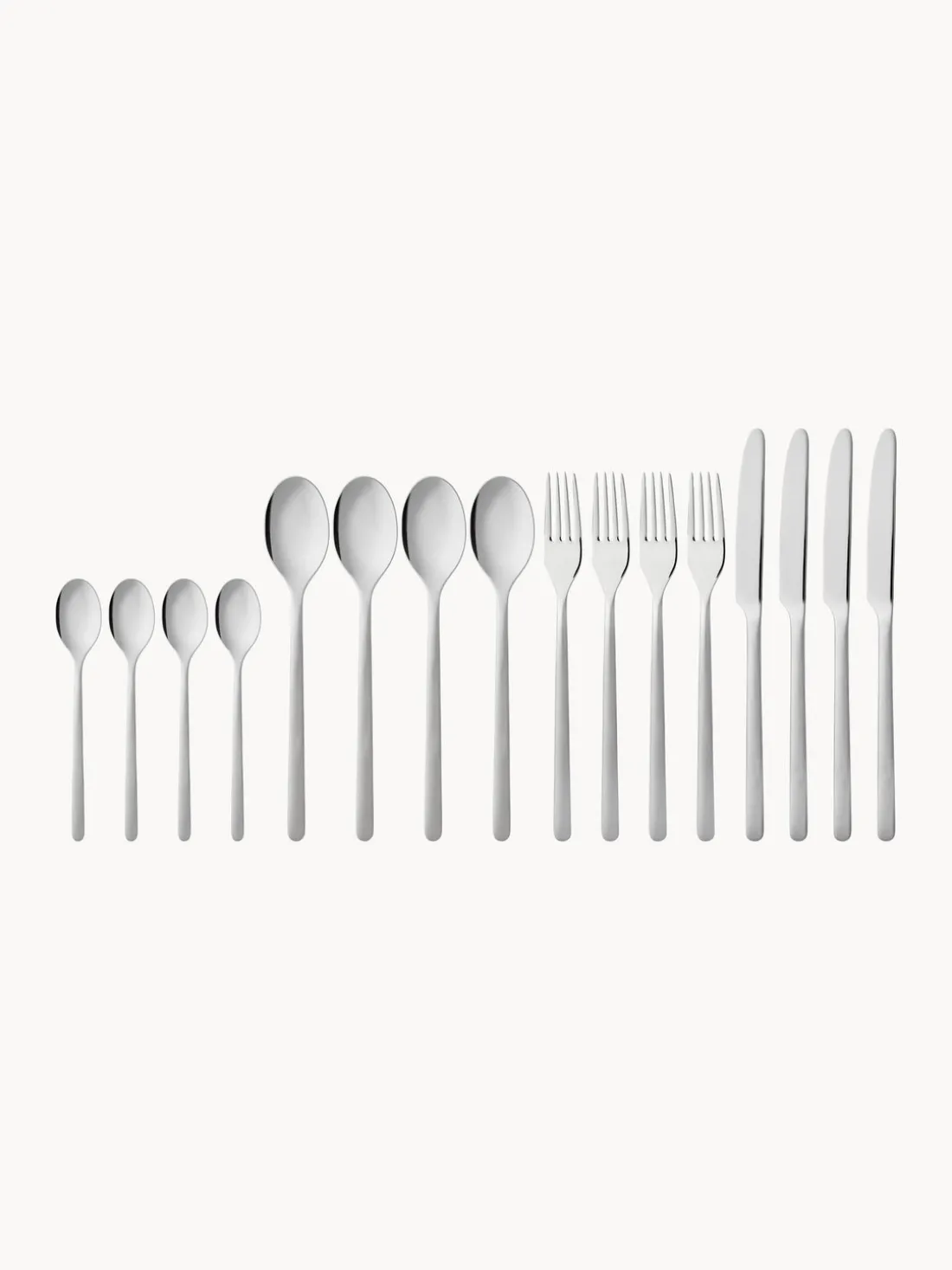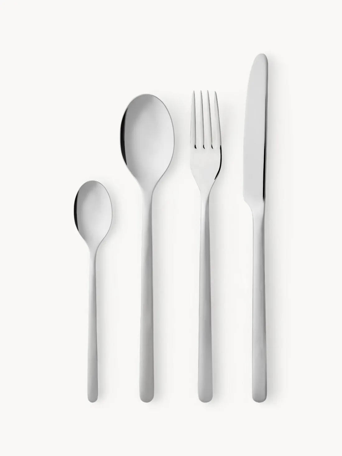 Esta cubertería de 16 piezas con superficie muy pulida consta de cuatro cuchillos, cuatro tenedores, cuatro cucharas y cuatro cucharillas.