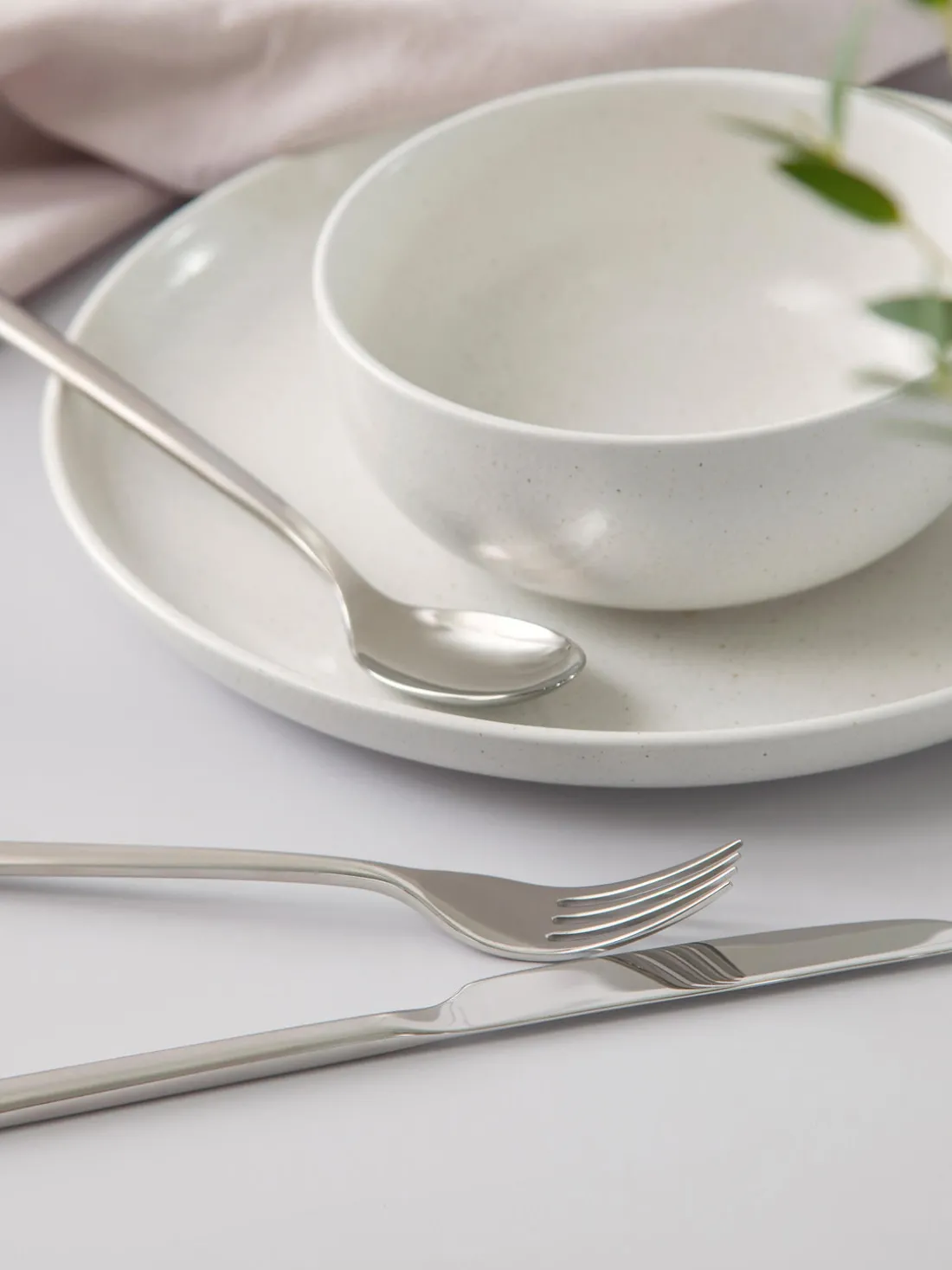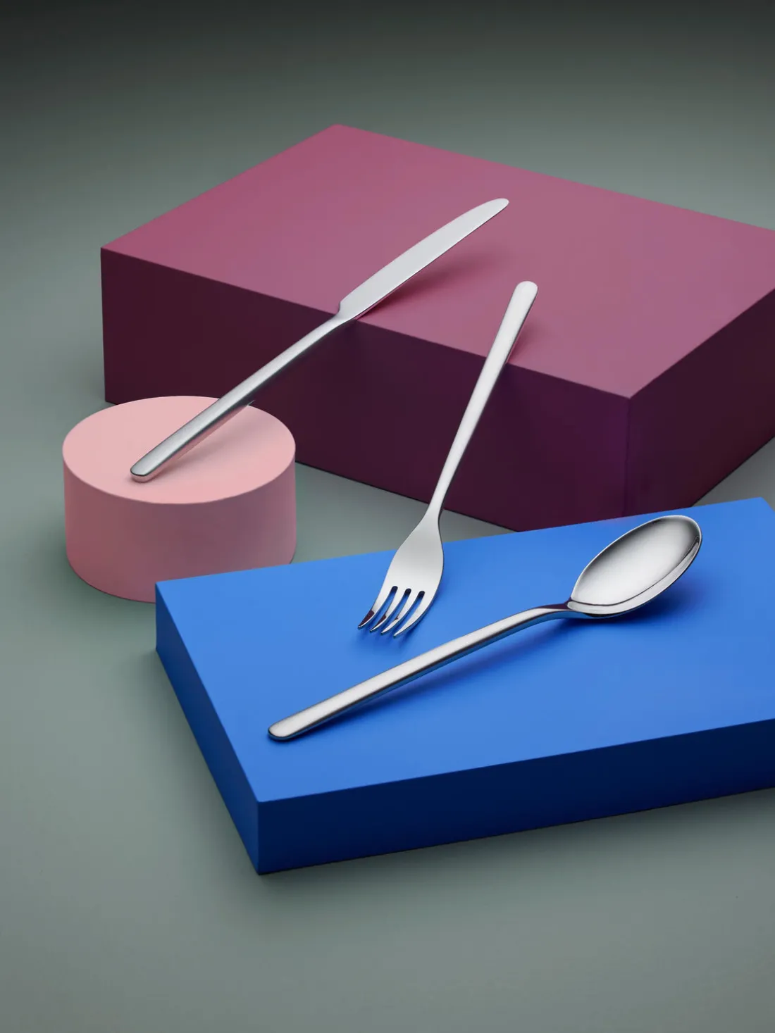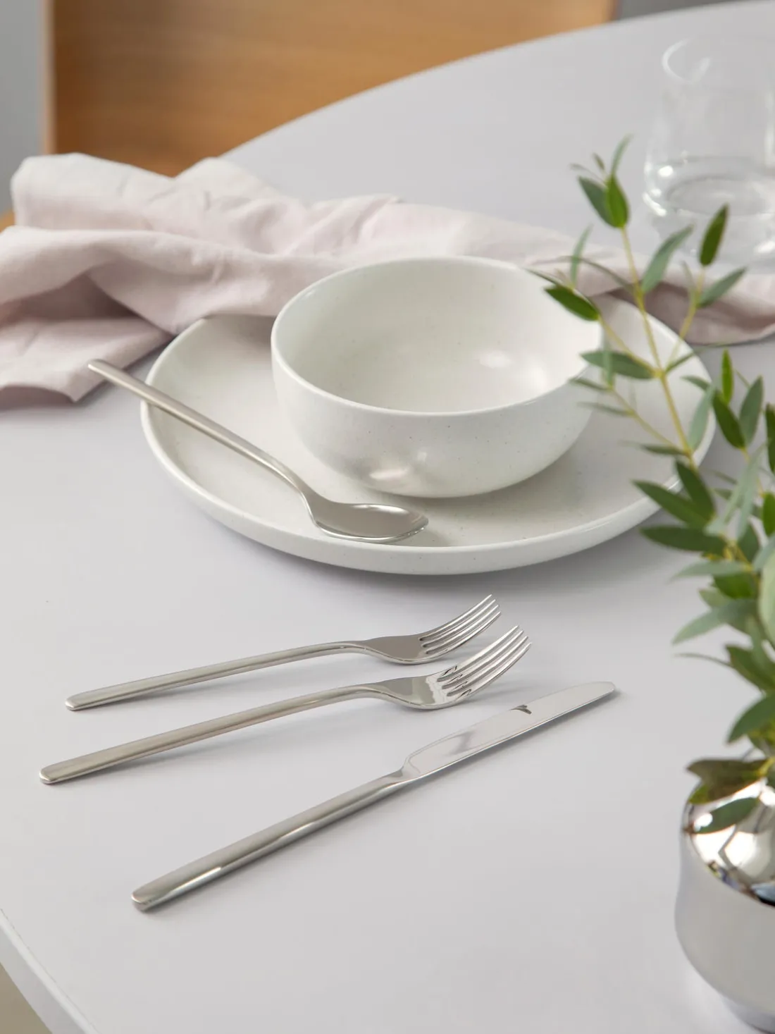 Esta cubertería de 16 piezas con superficie muy pulida consta de cuatro cuchillos, cuatro tenedores, cuatro cucharas y cuatro cucharillas.