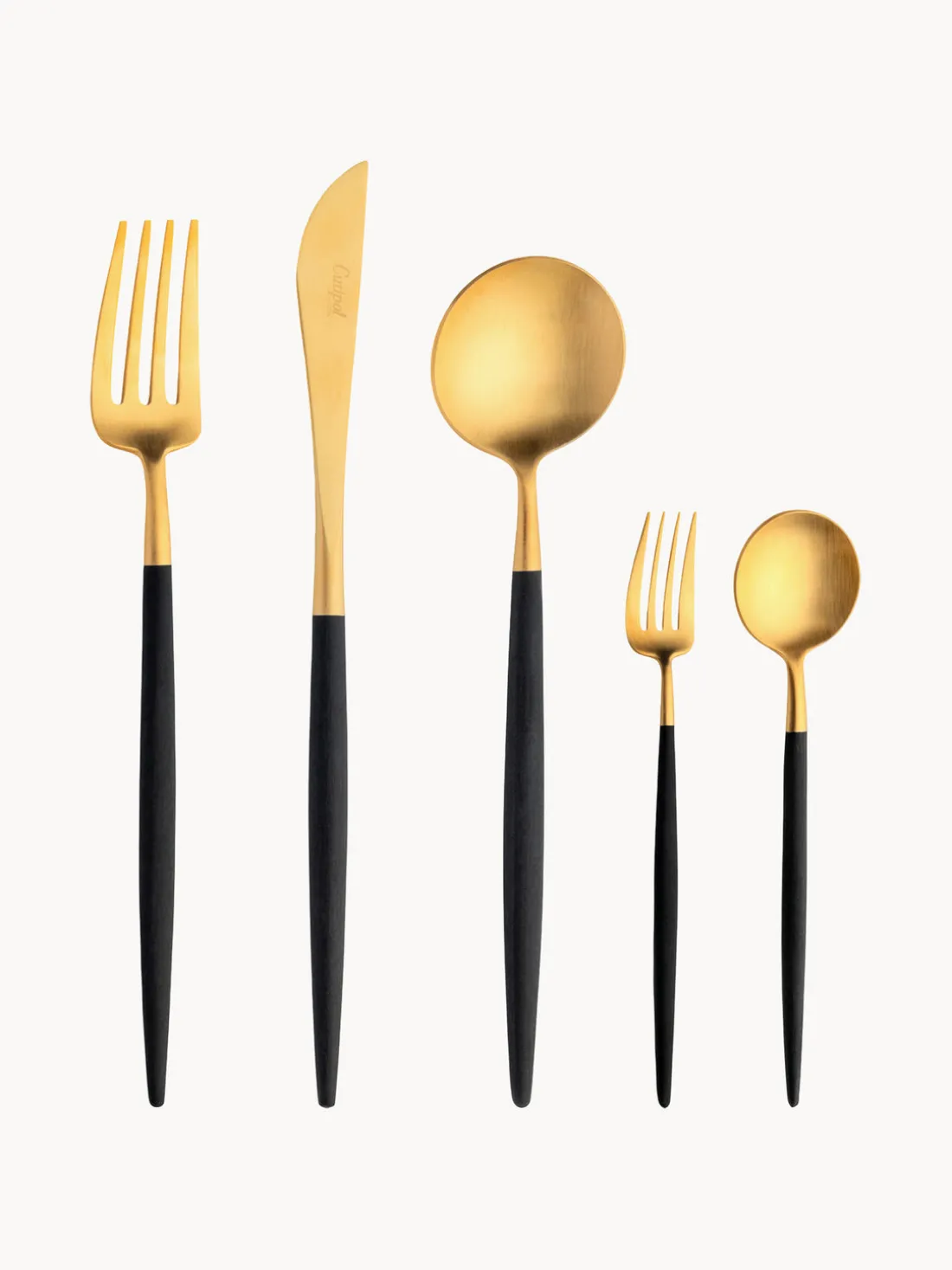Cubertería de 5 piezas hecha a mano que incluye un tenedor de mesa, un cuchillo de mesa, una cuchara de mesa, un tenedor de postre y una cuchara de postre.