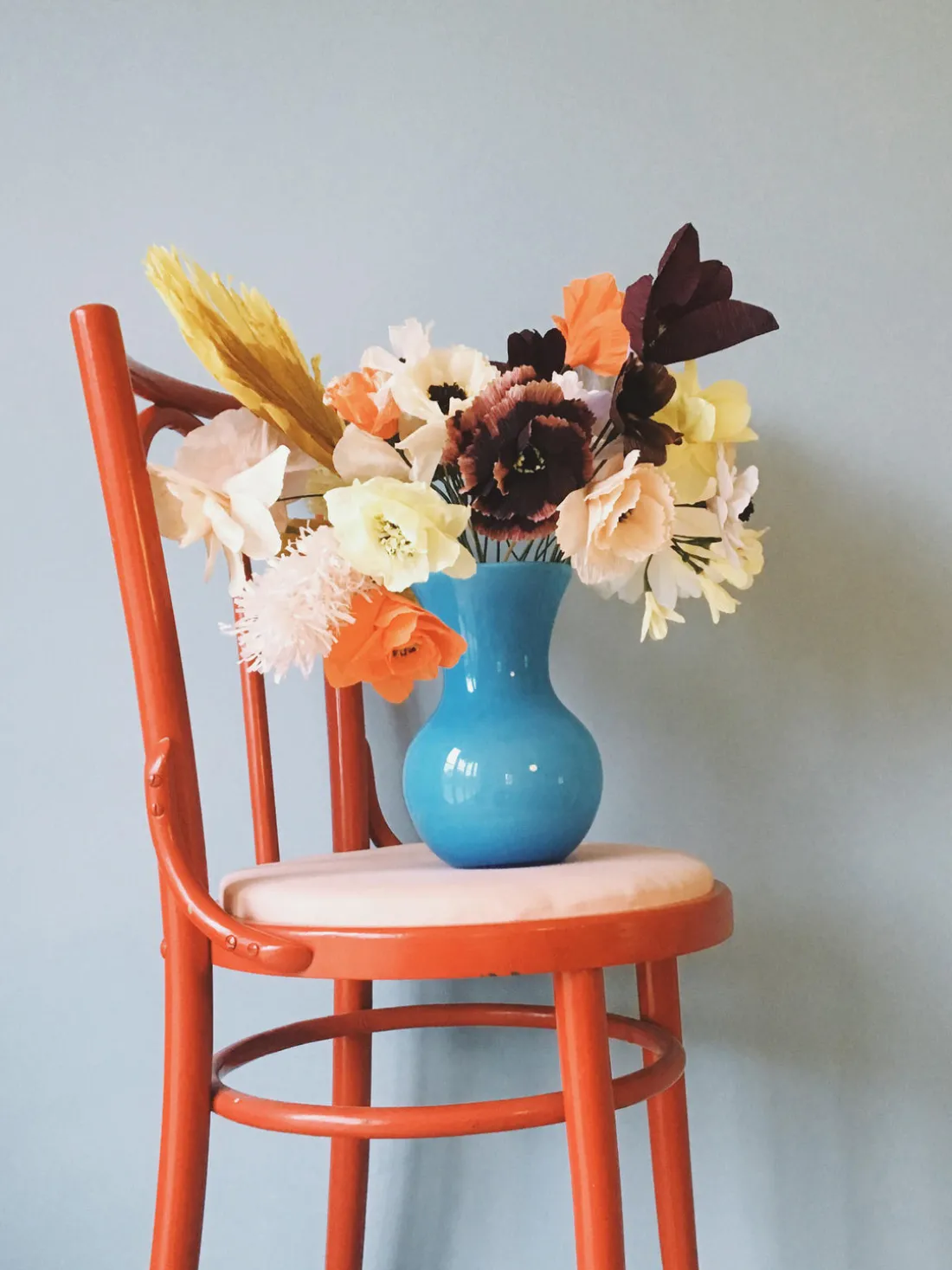 Esta flor está hecha de papel crepé teñido y montada en un tallo largo y flexible de color verde. Puedes moldear fácilmente el tallo para conseguir la forma y longitud que desees.