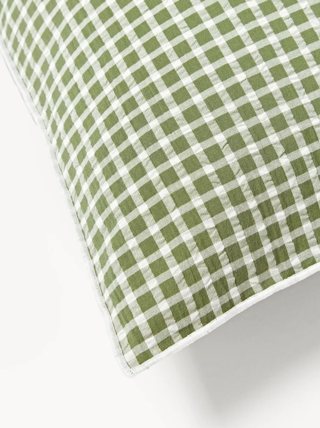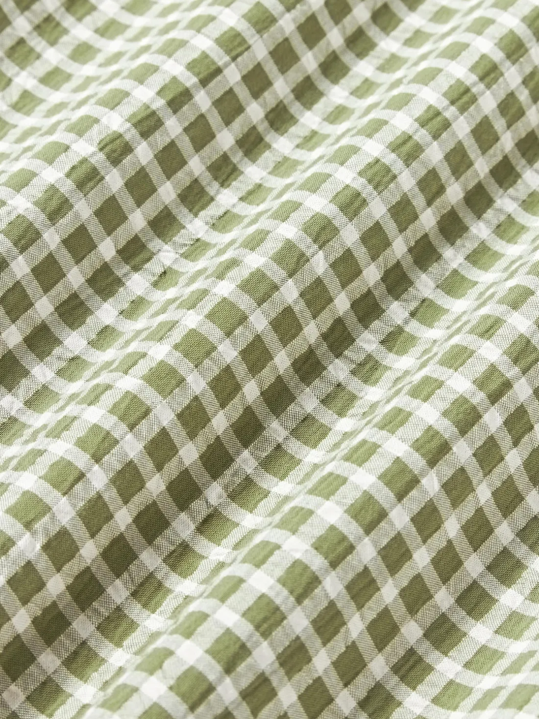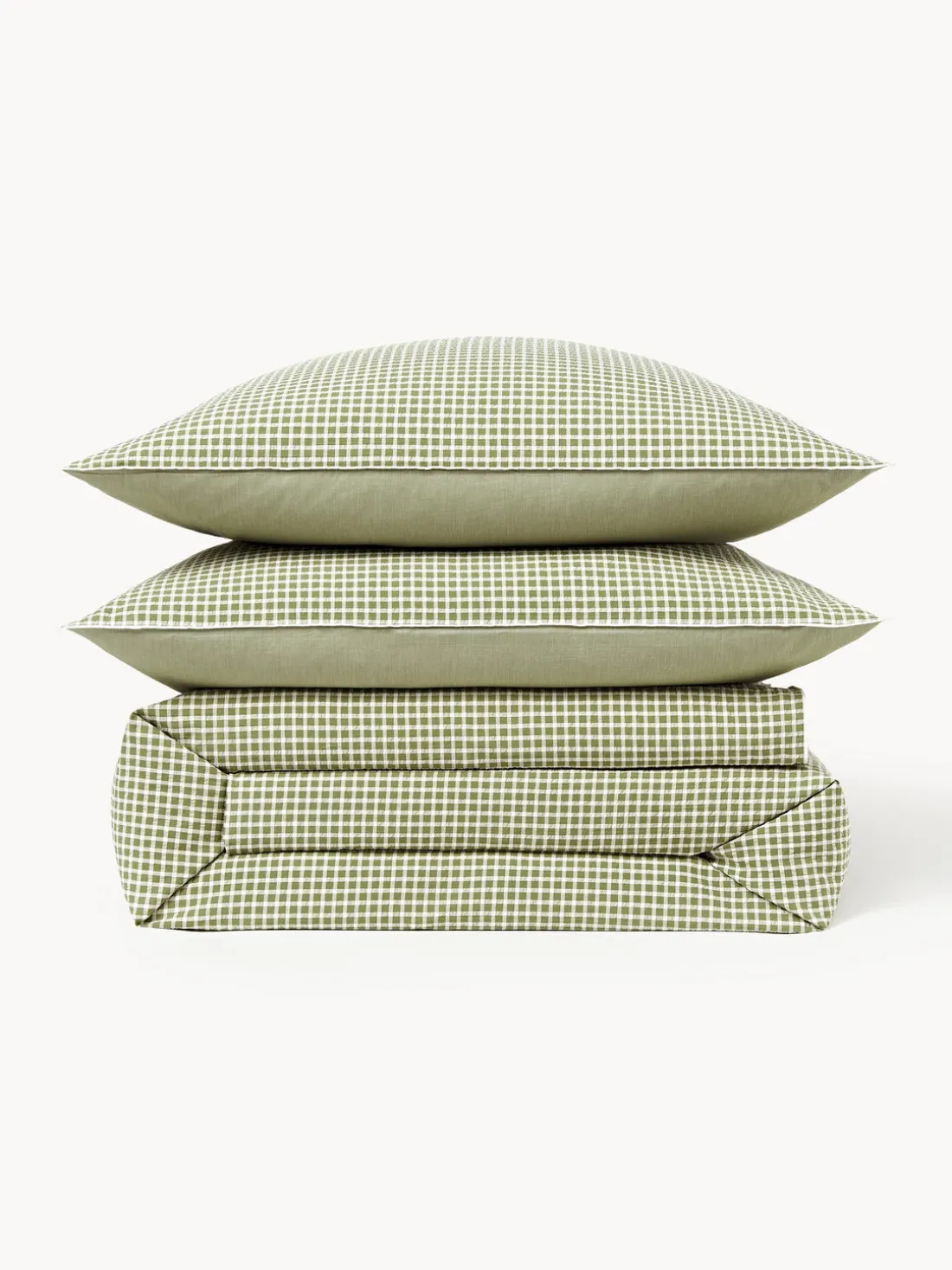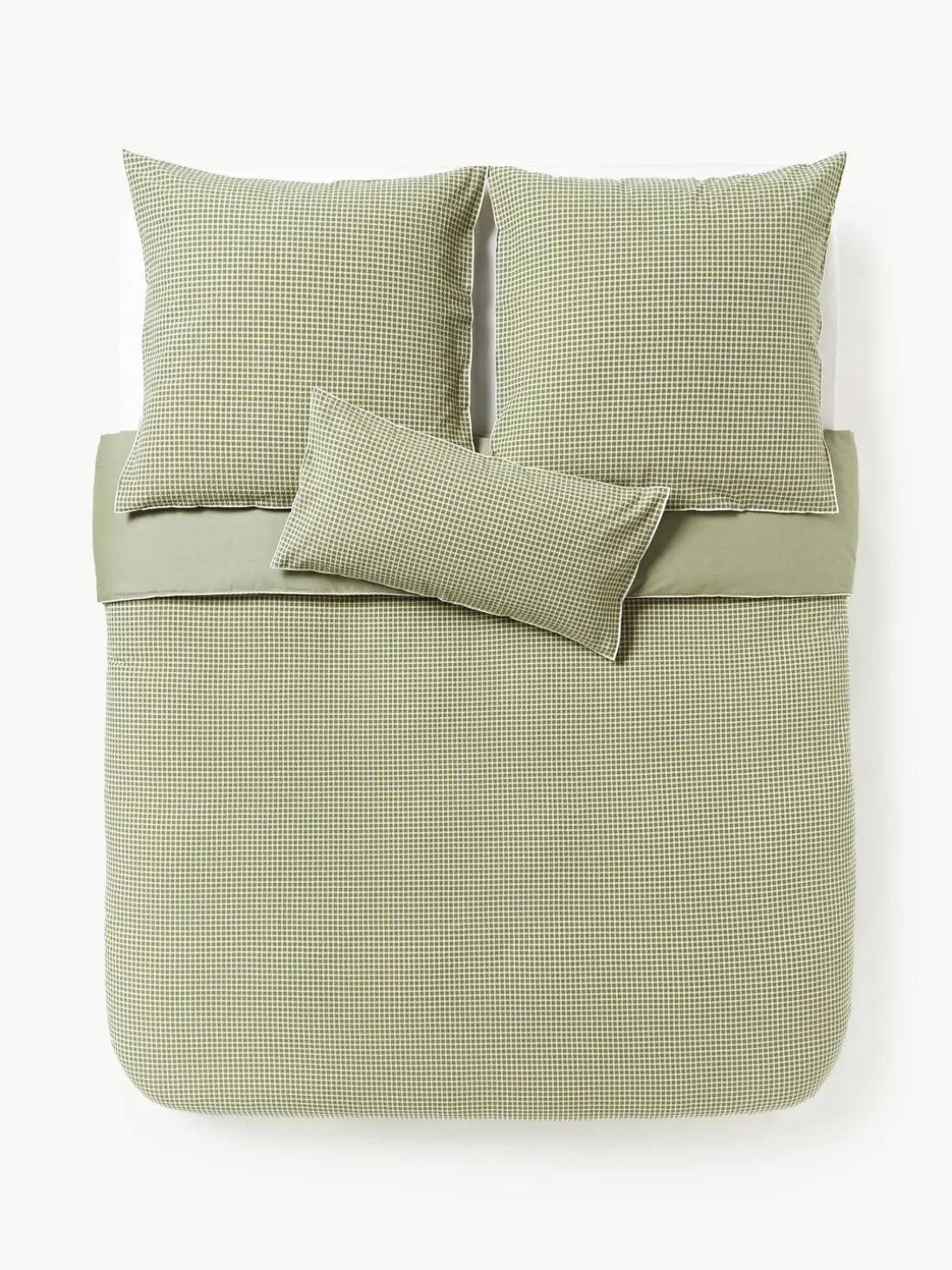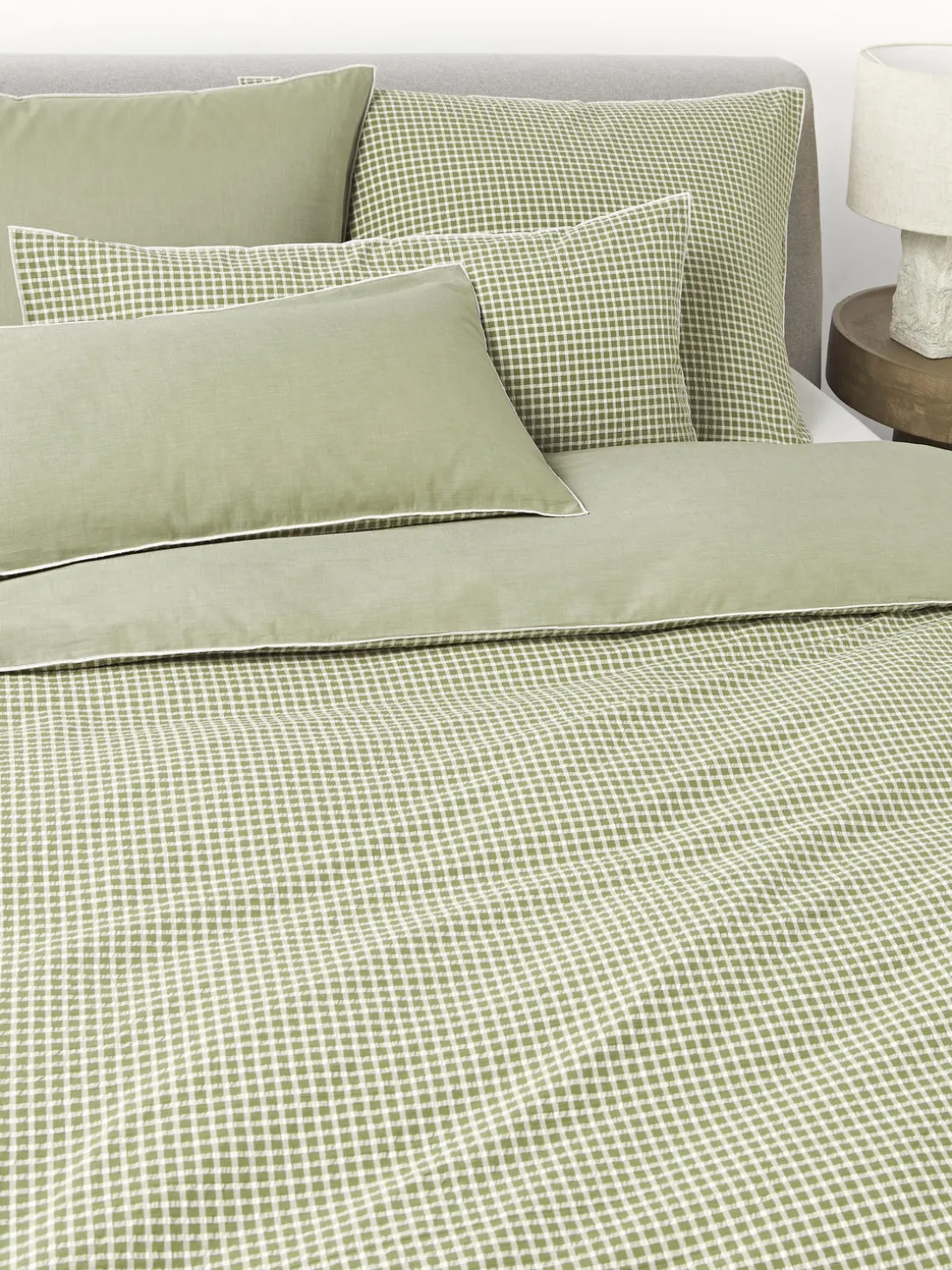 Funda nórdica de sirsaca con parte delantera a cuadros y parte trasera monocromática, tipo de cierre con botones. Hecho en Portugal.
