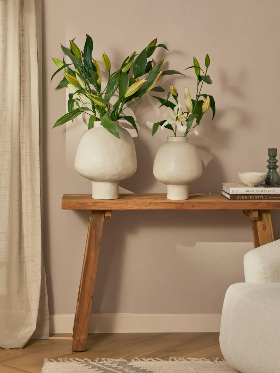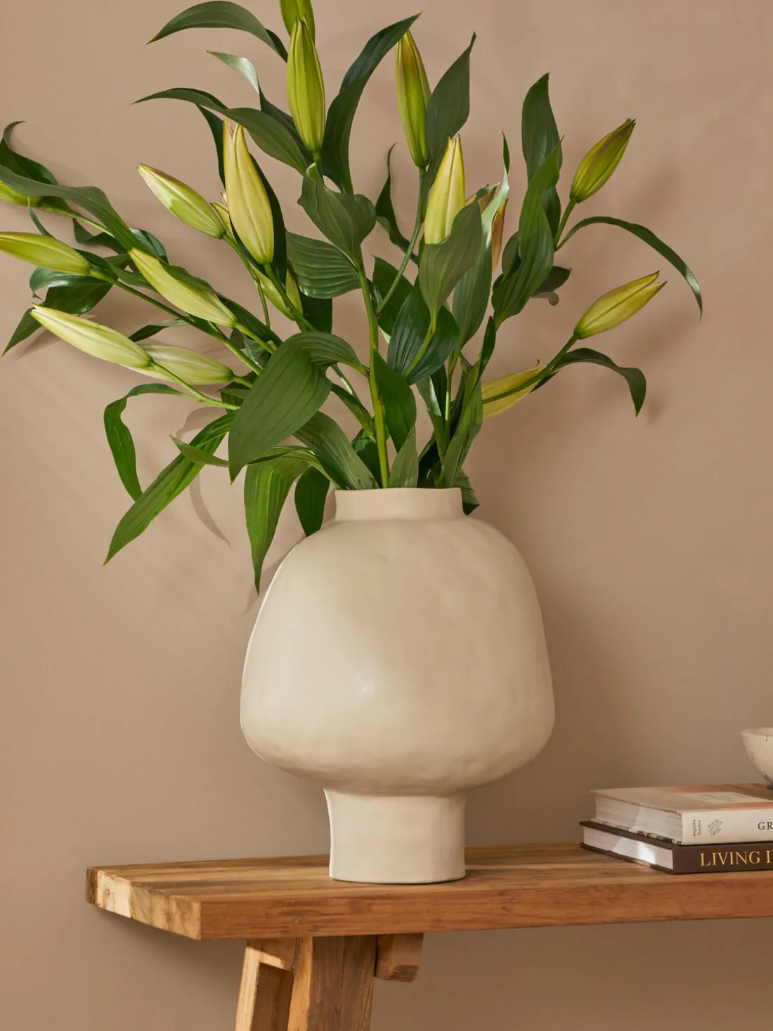 Ya sea con un ramo de tallo largo, hierba de la pampa o sin flores: SAKI es realmente versátil y no puede faltar en ningún hogar. Por cierto: la superficie irregular es típica del estilo wabi sabi, muy popular actualmente.