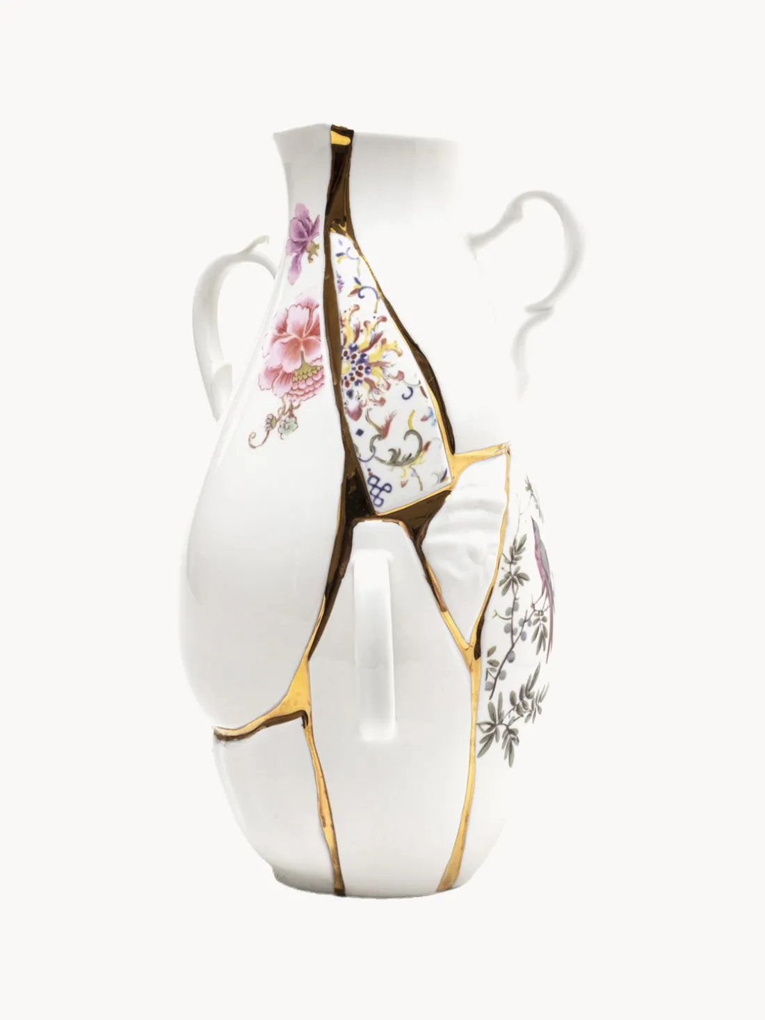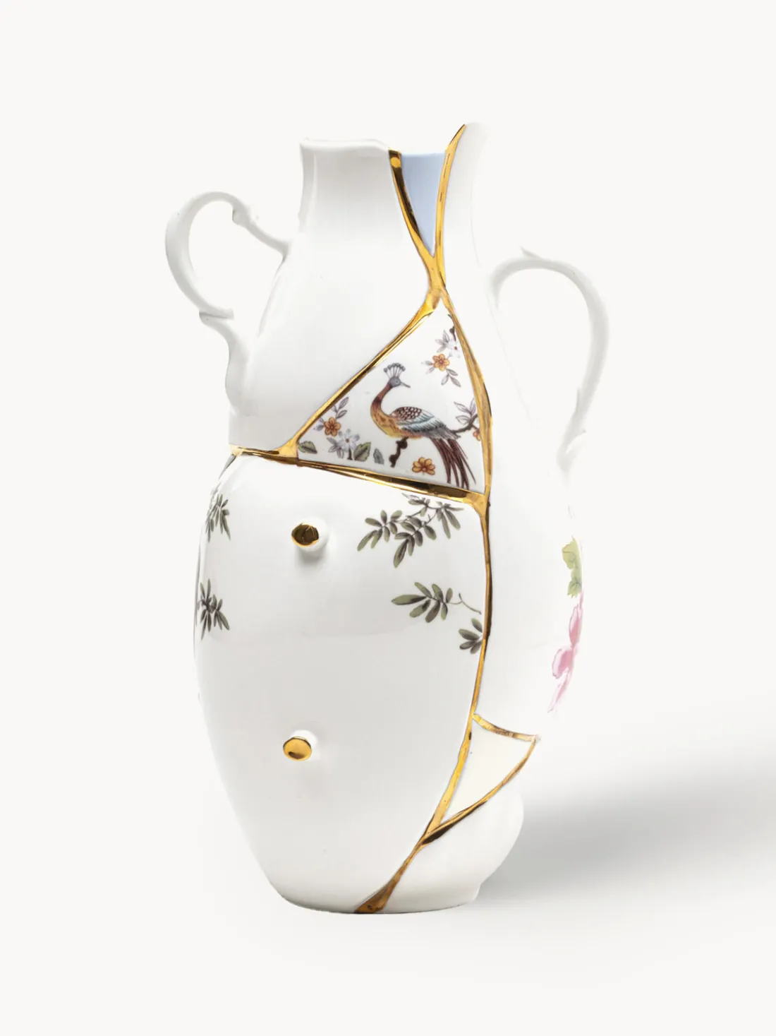 Este jarrón se inspiró en el arte tradicional japonés de reparar porcelana rota. La combinación del blanco con el dorado y un estampado floral crea un efecto llamativo. El jarrón Kintsugi exhibe flores, pero también funciona bien como decoración independiente.
