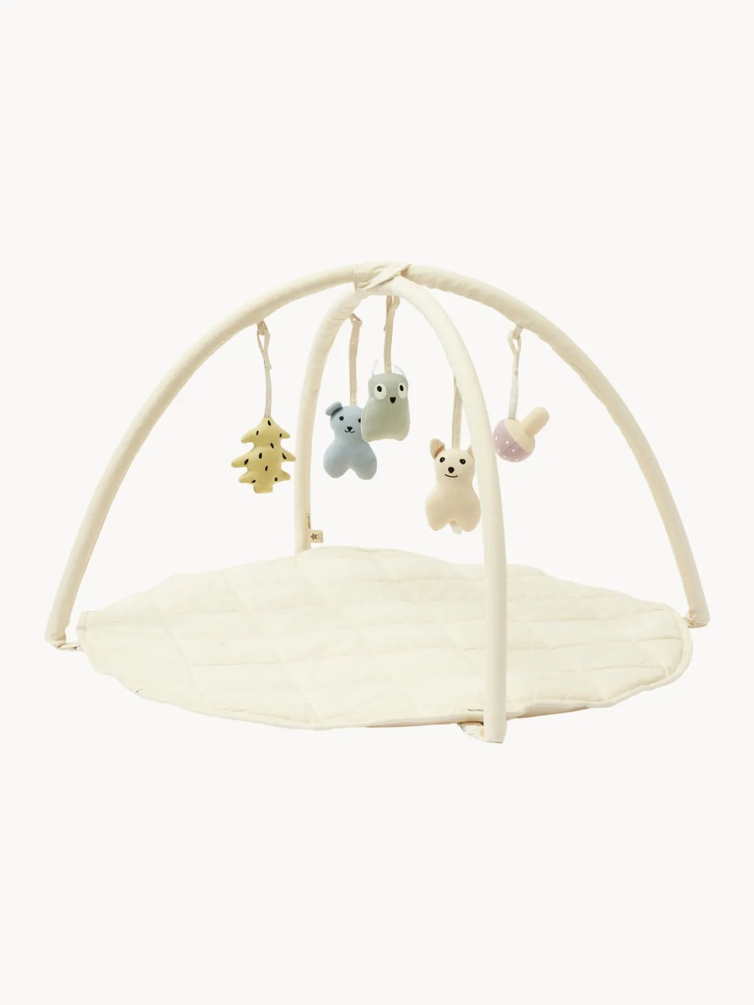 Juguete manta fabricado con cinco piezas de suave jersey de algodón. Dos de los animales tienen una discreta función sonajero. Se sujeta fácilmente con el cierre de velcro. Colócalo donde tu bebé necesite entretenimiento.