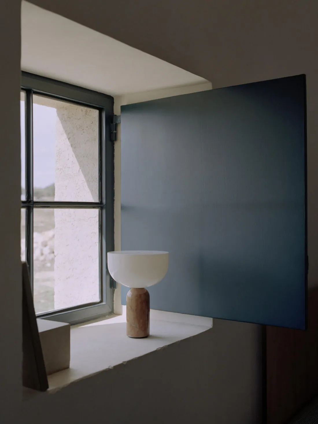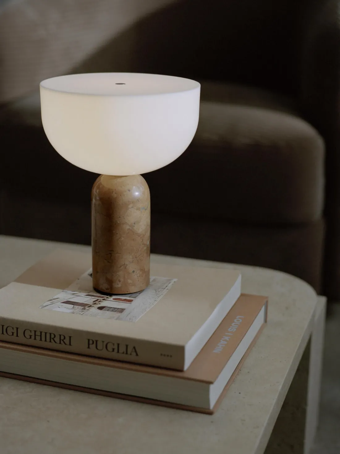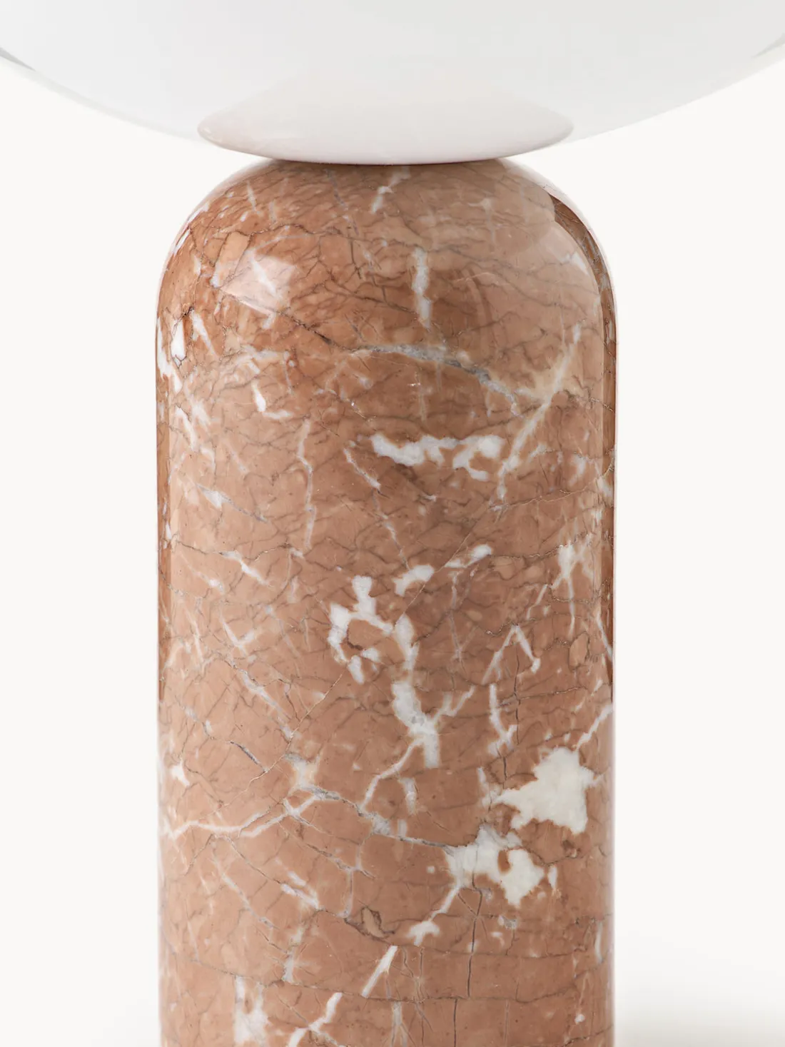 La base de mármol confiere a la lámpara una estabilidad natural, mientras que la superficie pulida se adapta cómodamente a la mano. La luz brilla desde toda la parte superior de la luminaria y proporciona una luminosidad impresionante a pesar de su pequeño tamaño. Un círculo metálico incrustado con precisión en la parte superior añade un sofisticado detalle de diseño y sirve también como regulador de intensidad: la luz puede regularse en tres niveles con un suave toque.
