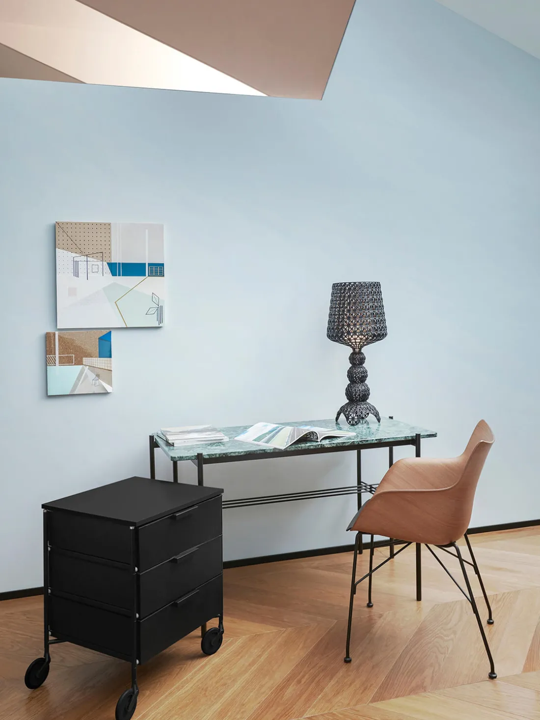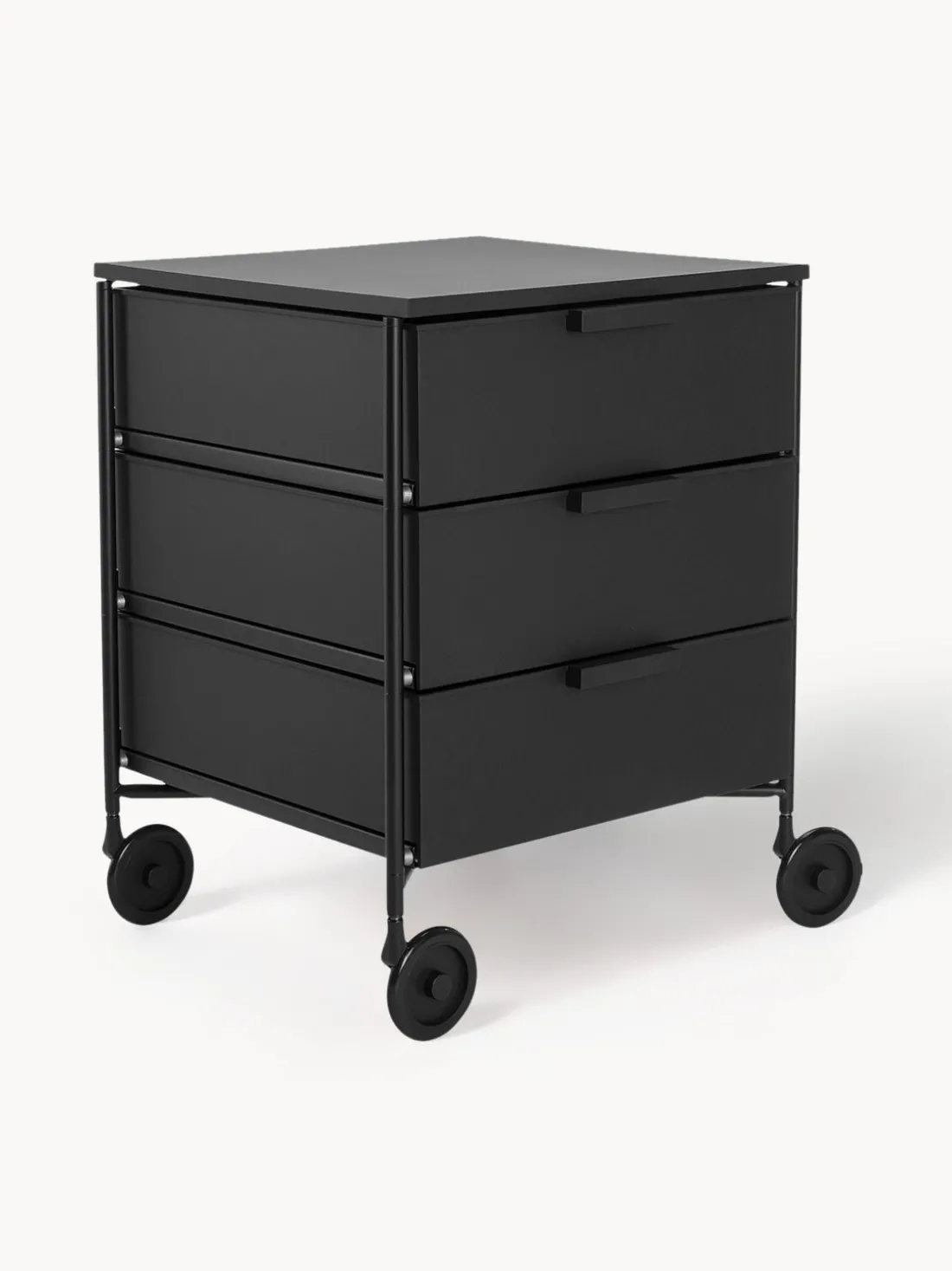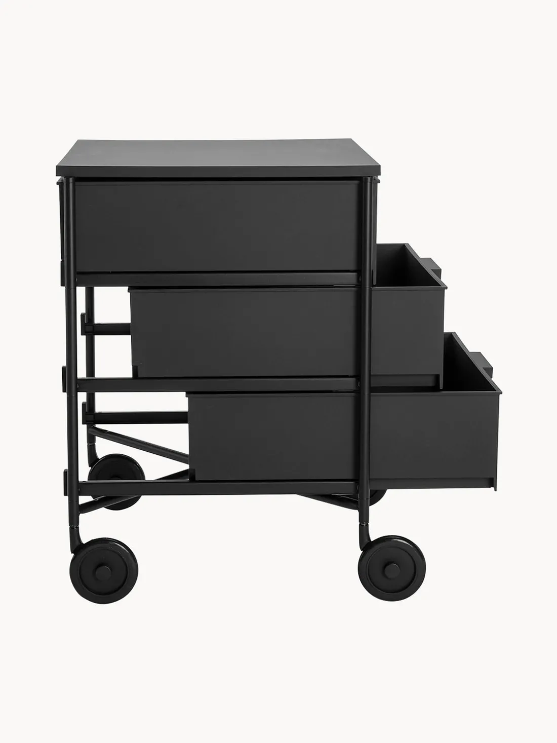 El contenedor móvil se entrega en un paquete que ahorra espacio y requiere que las ruedas se coloquen después de desembalar como trabajo de montaje.