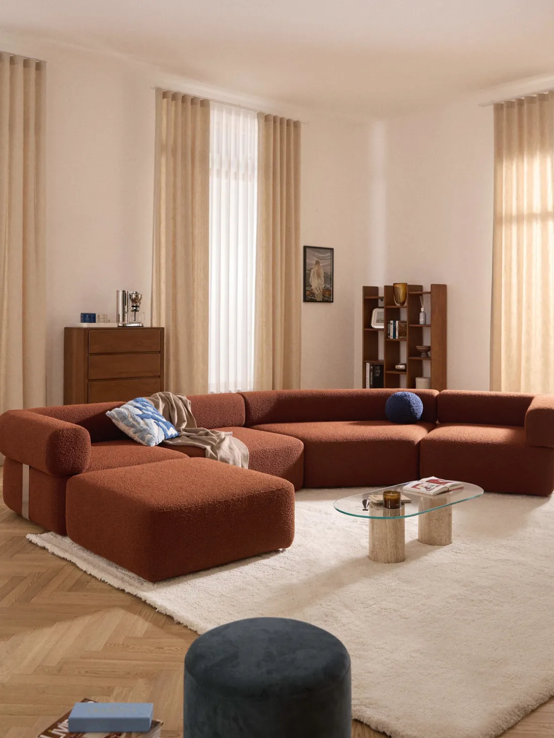Los cuatro módulos pueden combinarse de diversas formas. El sofá se entrega en cuatro partes que pueden conectarse individualmente mediante cierres situados en la parte inferior de los módulos.
