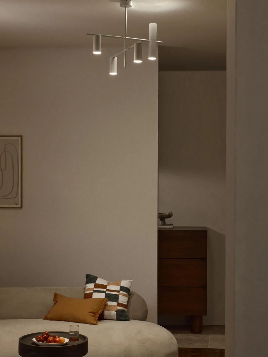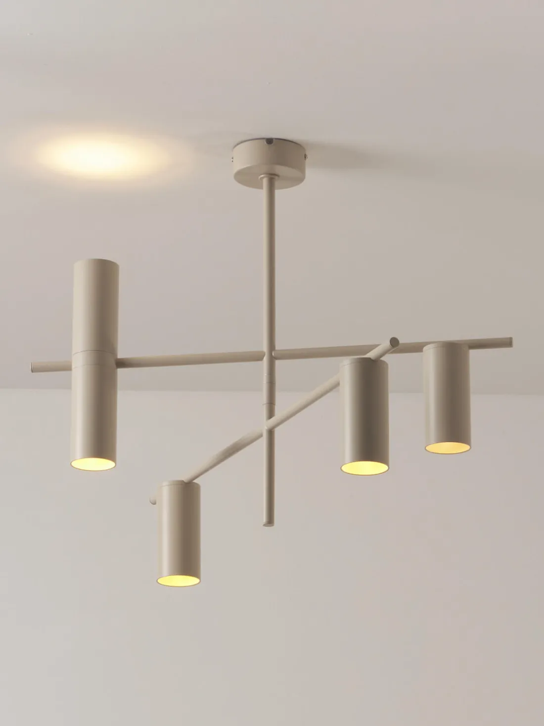 Cuatro focos de luz brillan en el suelo, un foco de luz brilla en el techo.