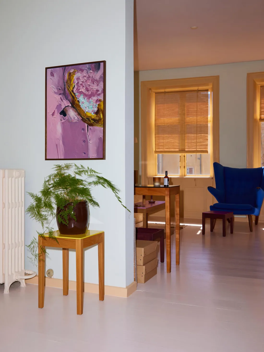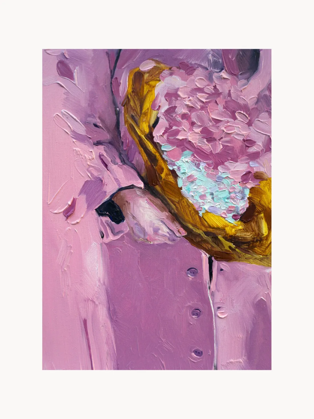 BLOOMING MOOD es una composición artística de una pintora residente en Copenhague, Lolita Pelegrim. Los vivos tonos lavanda y un toque de azul se combinan para crear una composición armoniosa. Una vista detallada de una figura que sostiene un ramo de flores cobra vida a través de las ricas texturas.