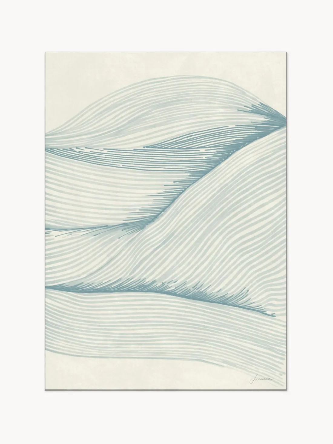 Suave y fluida obra de arte abstracta con delicadas líneas en tranquilos tonos azules, que transmite una sensación de calma y movimiento, ideal para añadir tranquilidad a cualquier espacio moderno.