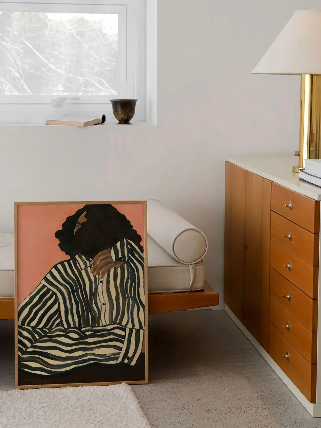 Este cartel representa artísticamente una figura en pose pensativa, vestida con una camisa a rayas que se funde con el fondo para crear un efecto visual impactante. Los tonos cálidos y las líneas atrevidas evocan una sensación de tranquila introspección.