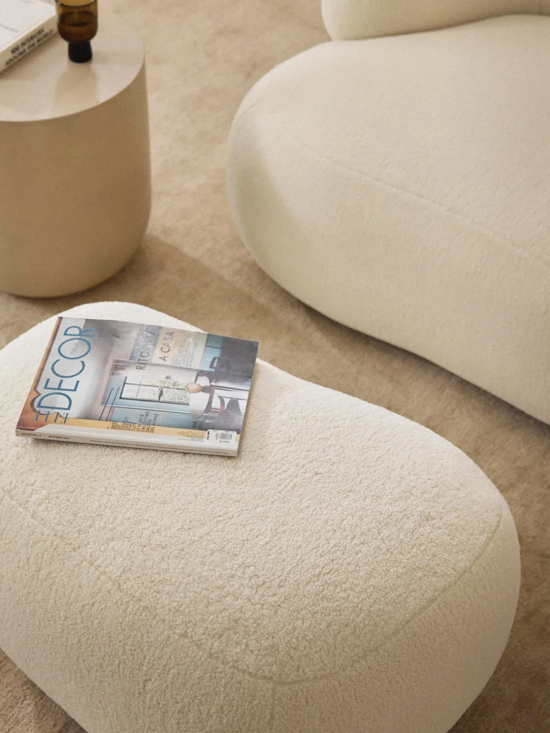 El arco está a la izquierda cuando estás frente al puf. Esto significa que este puf encaja perfectamente con el sillón ALBA con reposabrazos a la izquierda.