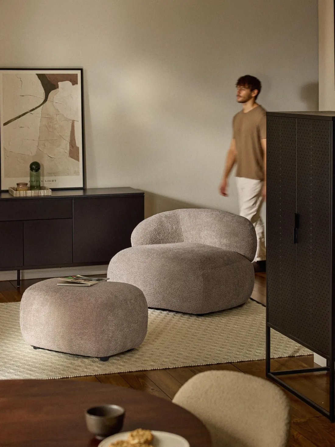 El arco está a la izquierda cuando estás frente al puf. Esto significa que este puf encaja perfectamente con el sillón ALBA con reposabrazos a la izquierda.