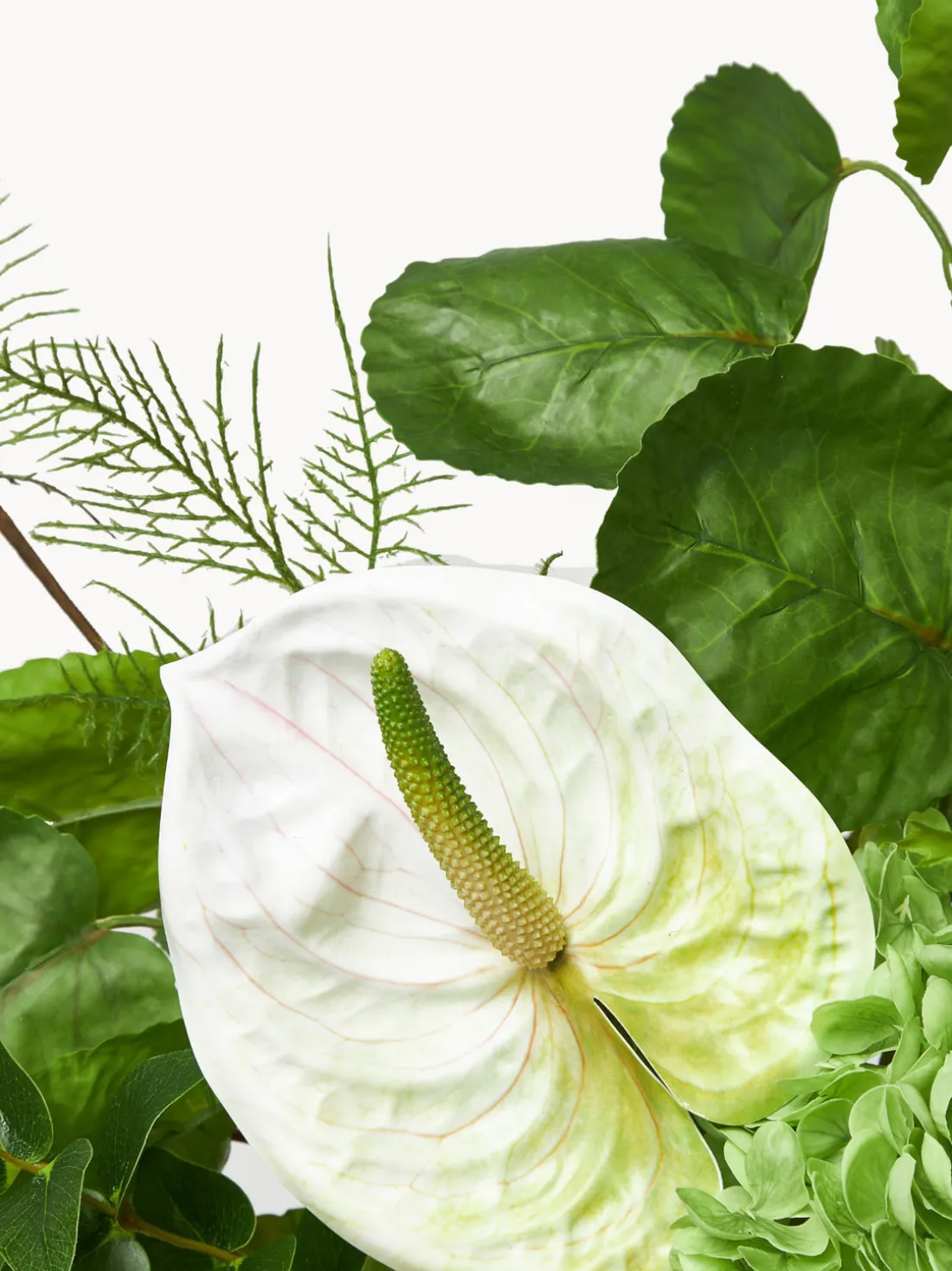 Este ramo presenta una armoniosa mezcla de verdes suaves y texturas naturales, creando una composición fresca y serena. Los exuberantes brotes de hortensia añaden volumen, mientras que los anthuriums escultóricos y las delicadas cápsulas de semillas aportan detalles refinados. El amaranto fluido y los aéreos helechos aportan movimiento, complementados con un follaje estructurado para mayor profundidad. Este ramo consta de un total de diez tallos.