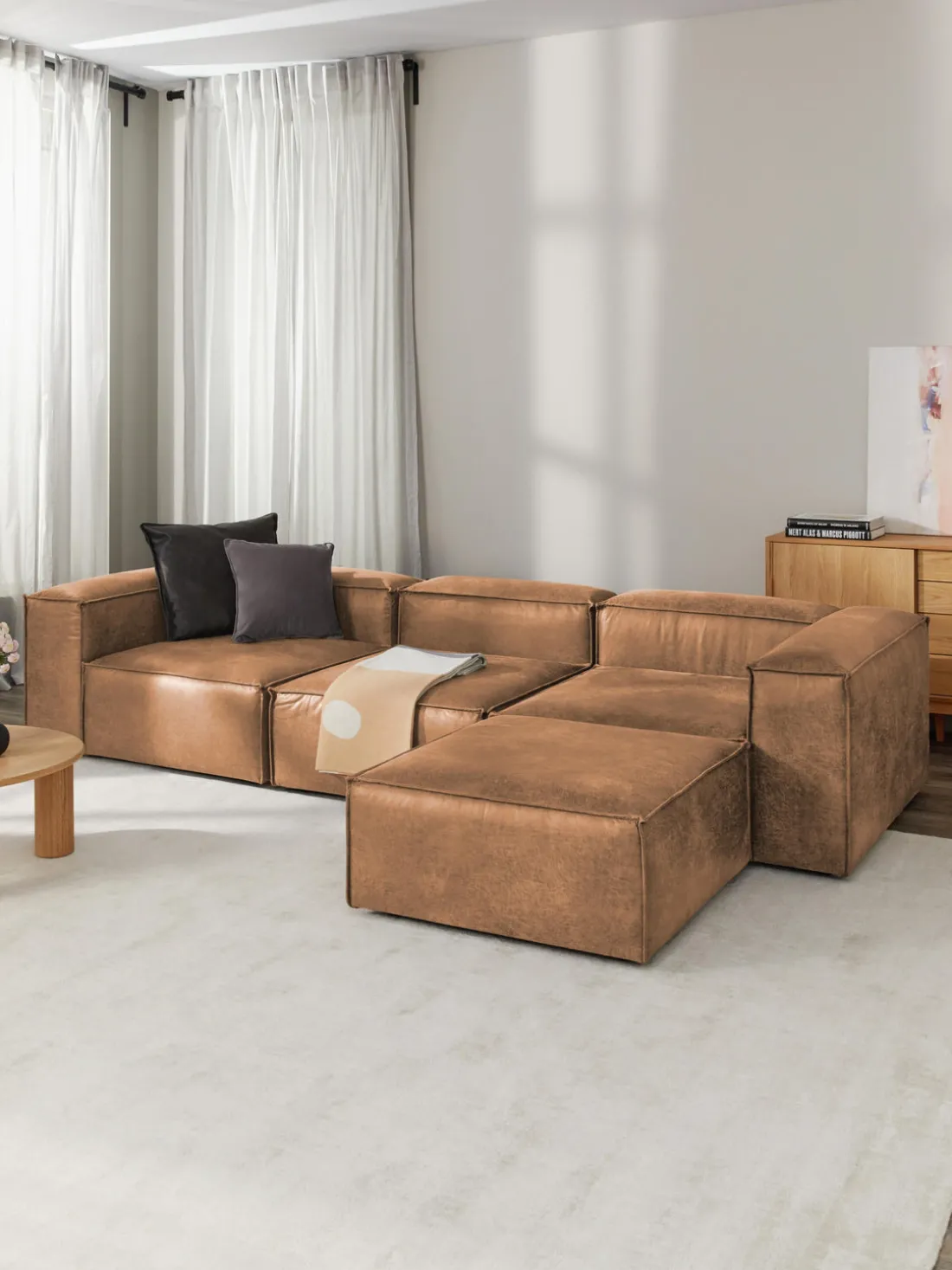 También puedes descubrir otros productos a juego en nuestra gama que se adaptan perfectamente a LENNON: la consola LANA no solo ofrece espacio de almacenamiento adicional, sino que también es un elemento decorativo que se adapta exactamente a las dimensiones de LENNON. El taburete LENNON con bandeja de madera se puede utilizar de forma flexible como mesa de centro o como elemento intermedio en el sofá, para conseguir un aspecto elegante y espacio de almacenamiento práctico. No te olvides del complemento perfecto: cojines de sofá en todos los tejidos y colores de LENNON para un look perfecto, ya sea uniforme o en un estilo mix & match.
