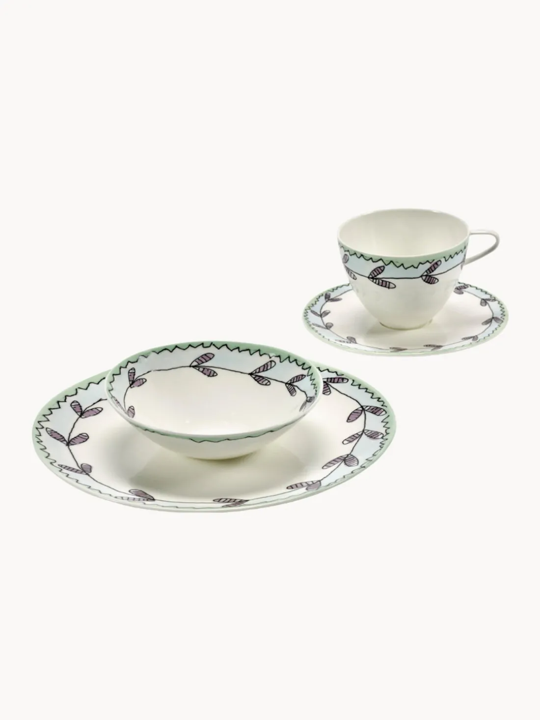 Esta vajilla consta de 6 piezas: dos platos postre, dos cuencos pequeños y dos tazas.