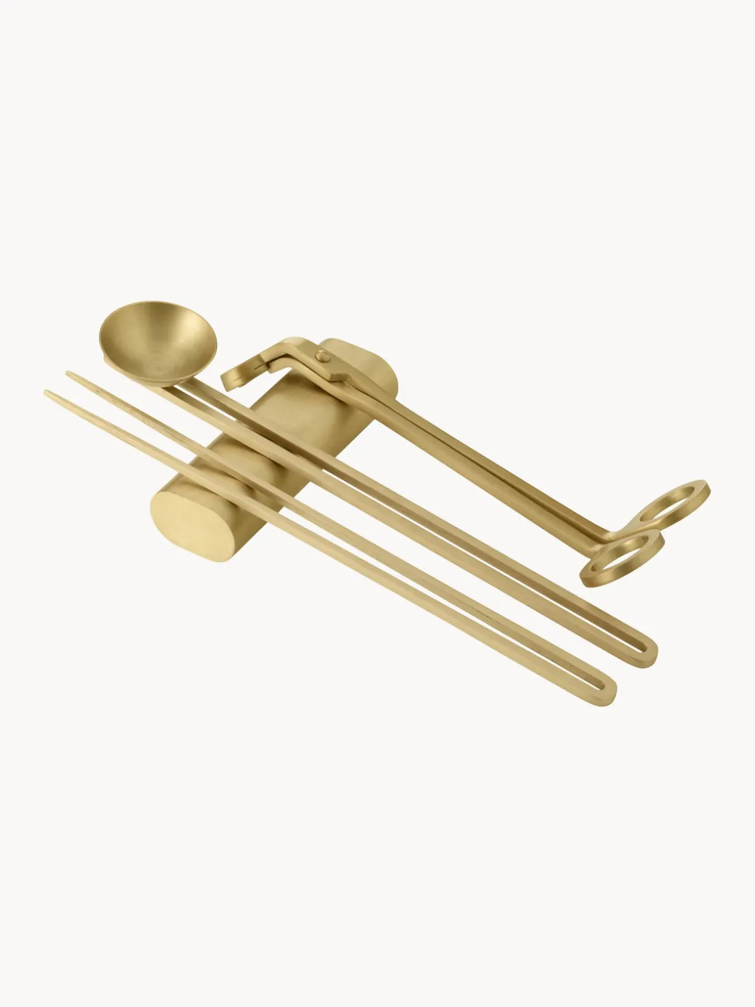 El set diseñado para el cuidado y rendimiento óptimo de velas se compone de cuatro piezas e incluye elegantes herramientas hechas de metal con recubrimiento en polvo. Un apagavelas, un cortador de mecha y un recogedor garantizan menos humo y hollín, una mejor combustión y una extinción limpia de las llamas, mientras que la bandeja adjunta almacena los artículos cuando no están en uso.