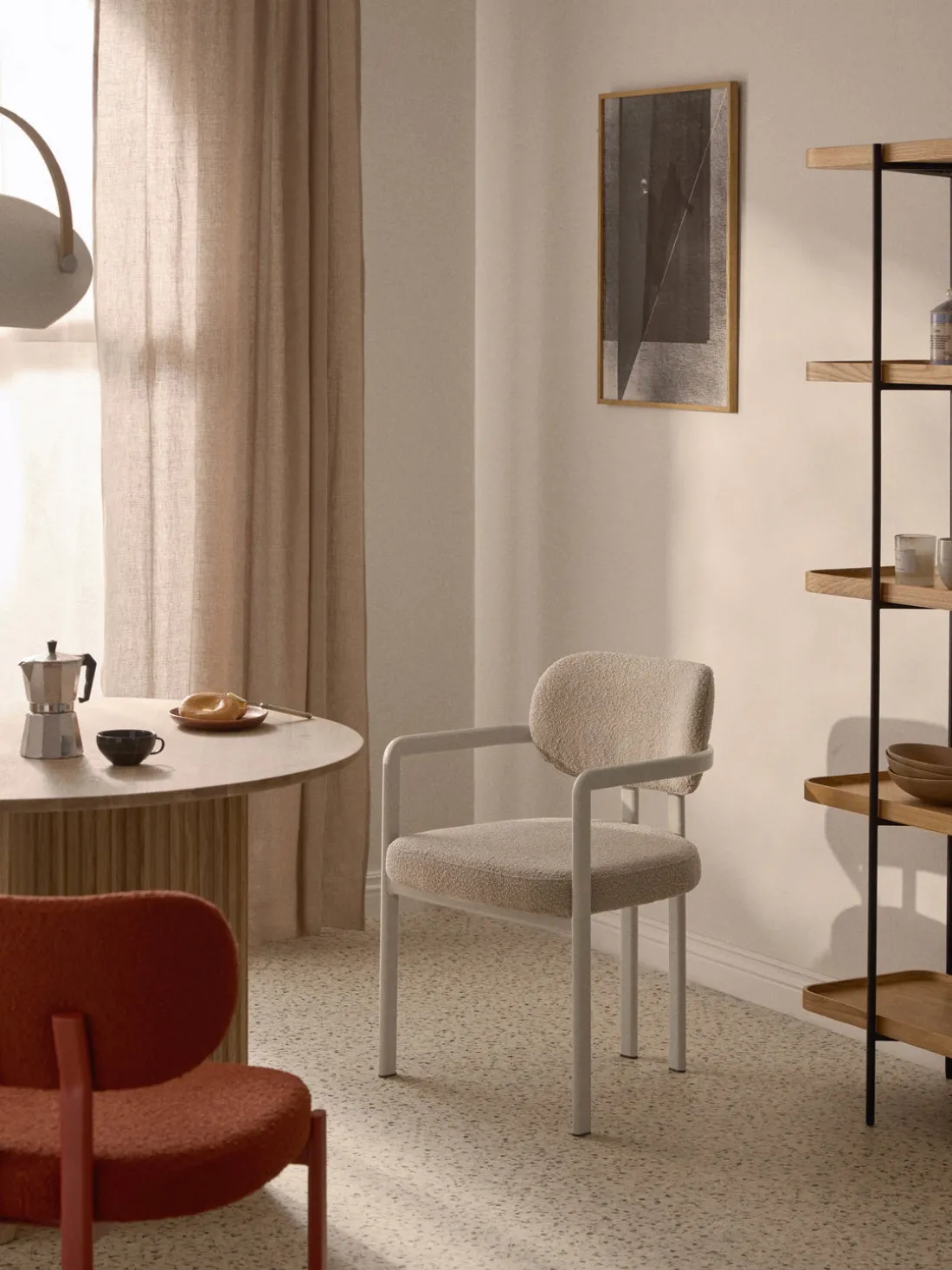 La silla ADRIEN es una clase magistral de contrastes: mezcla influencias de mediados de siglo con minimalismo contemporáneo para crear una pieza atemporal y moderna a la vez. Su envolvente silueta de inspiración retro está envuelta en bouclé táctil, que suaviza la atrevida geometría con una sensación de lujo tranquilo. La línea curva que va desde el brazo hasta el respaldo crea una fluidez escultural, mientras que su tamaño compacto y la sobriedad de sus detalles le confieren una claridad elegante y arquitectónica. ADRIEN aporta armonía, carácter y una estética refinada a cualquier interior. Una declaración de forma y comodidad en perfecto equilibrio.