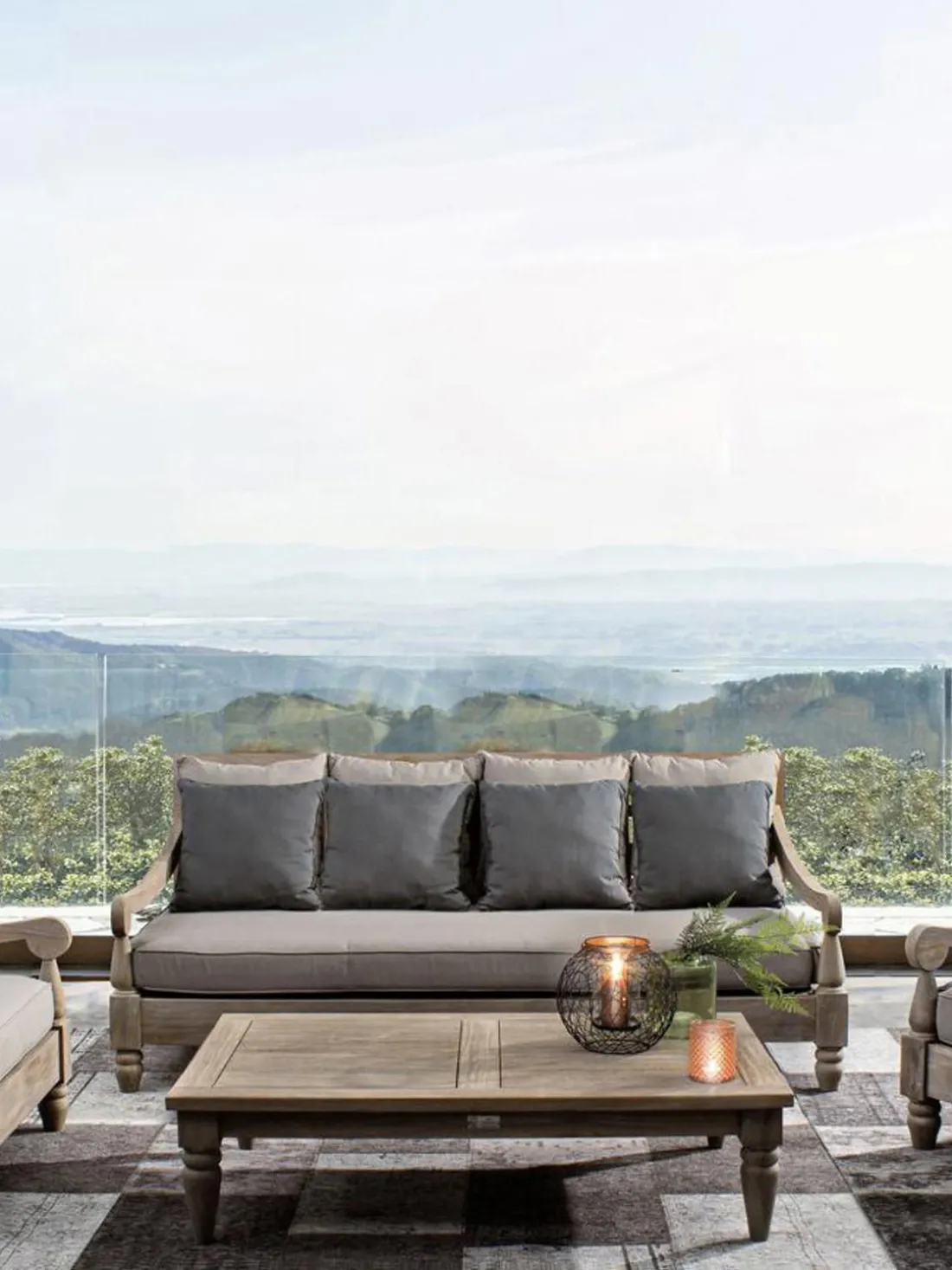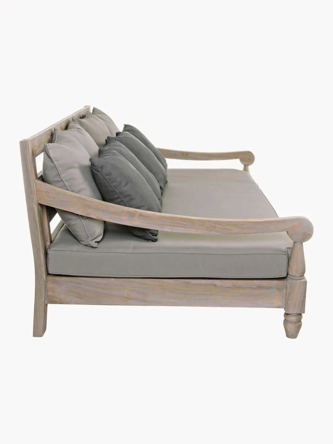 El sofá de madera de teca resistente y duradera impresiona por su resistencia a la intemperie.