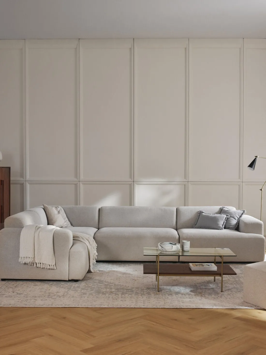 La chaise longue está en el lado izquierdo cuando estás frente al sofá.