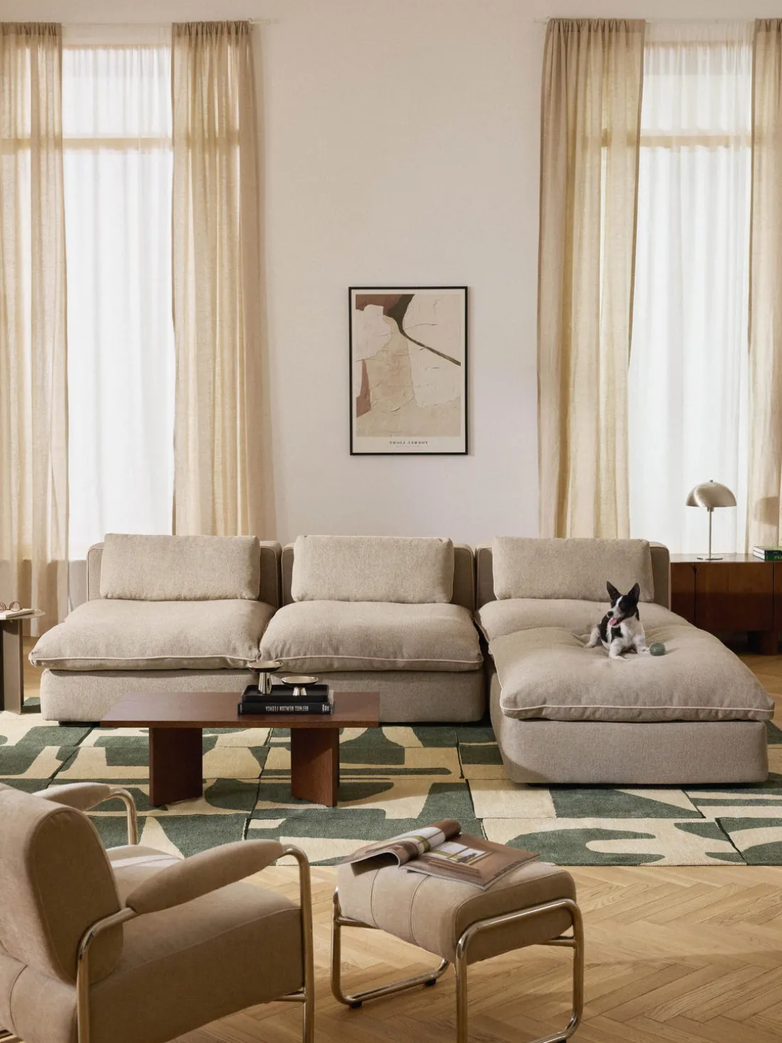 Nuestro sofá modular Felix consta de tres módulos y un reposapiés que pueden combinarse individualmente.