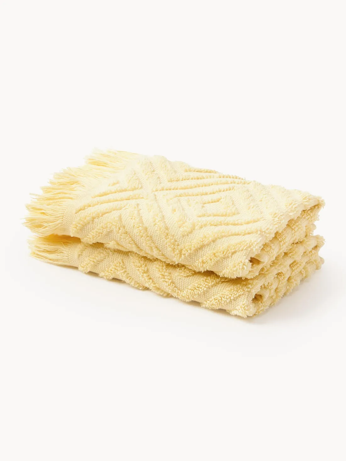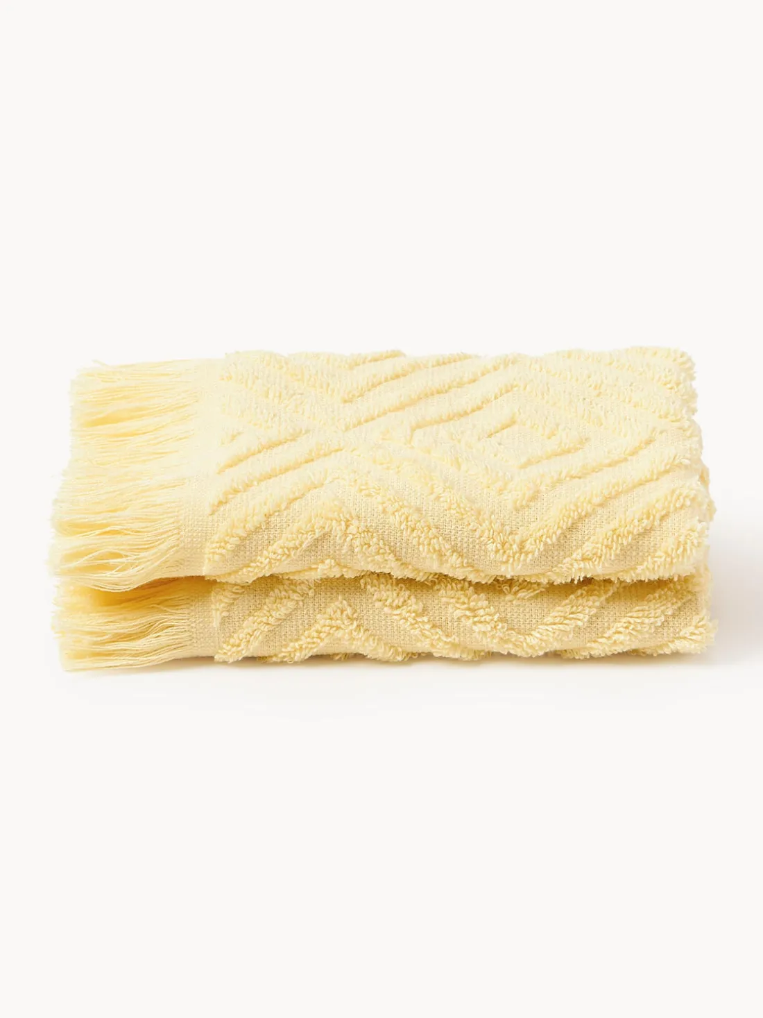 Set de toallas con flecos y caras diferentes, parte superior texturizada, reverso liso, que consiste en dos toallas de tocador con lazo para colgar. Hecho en Portugal.