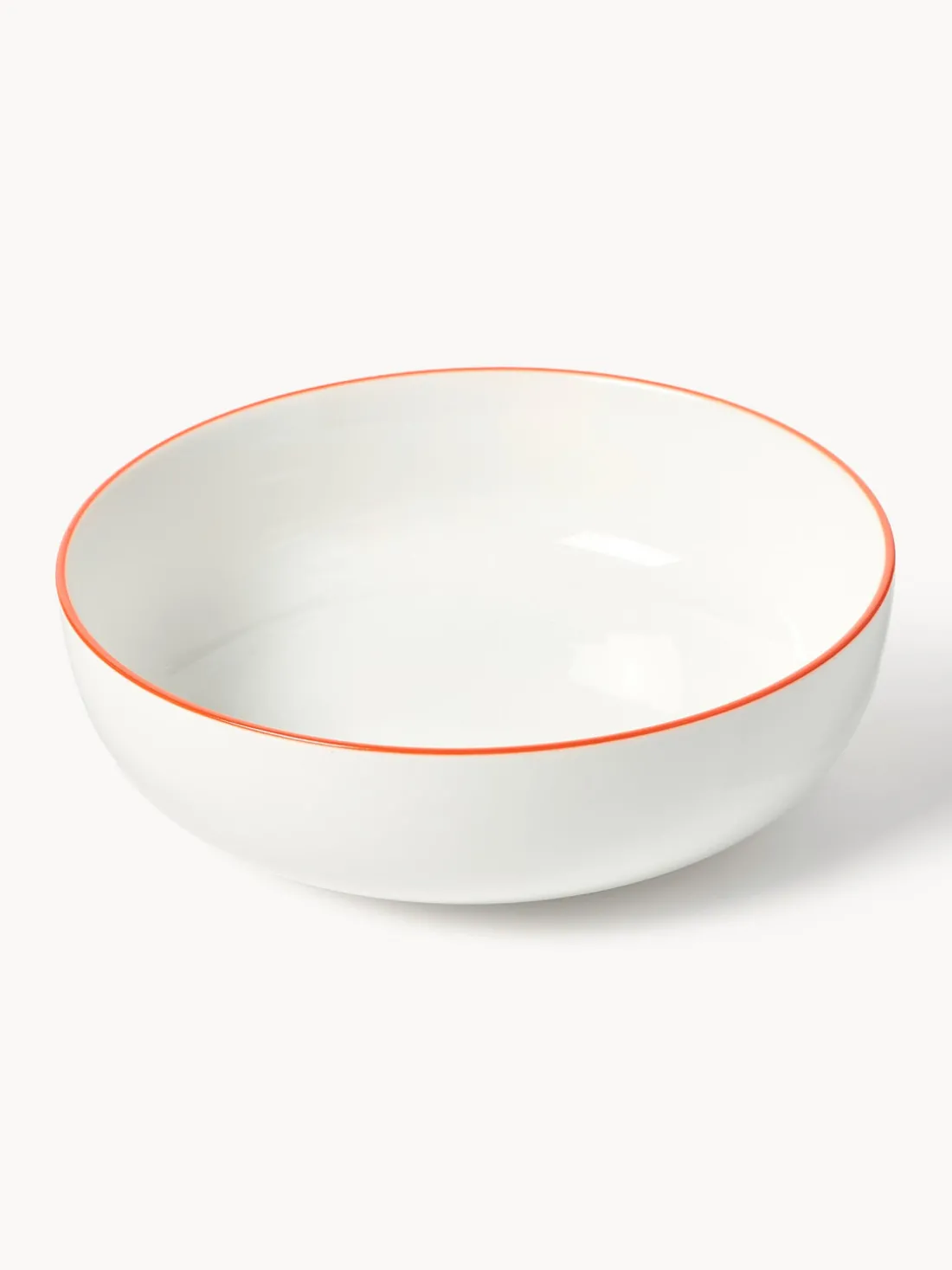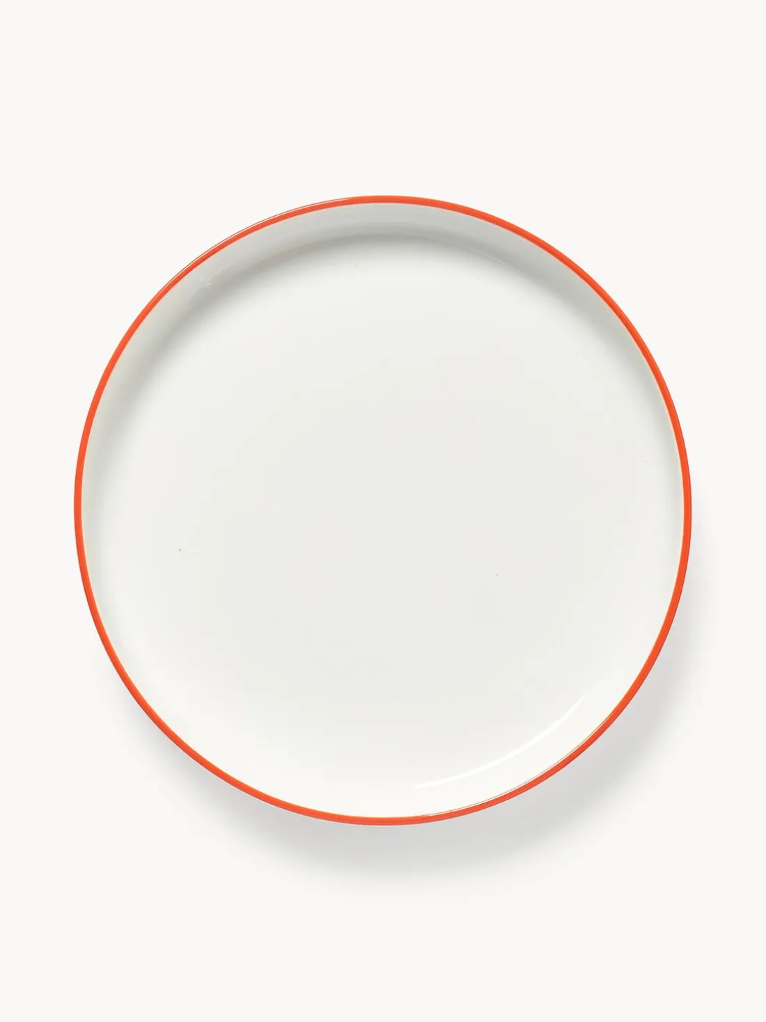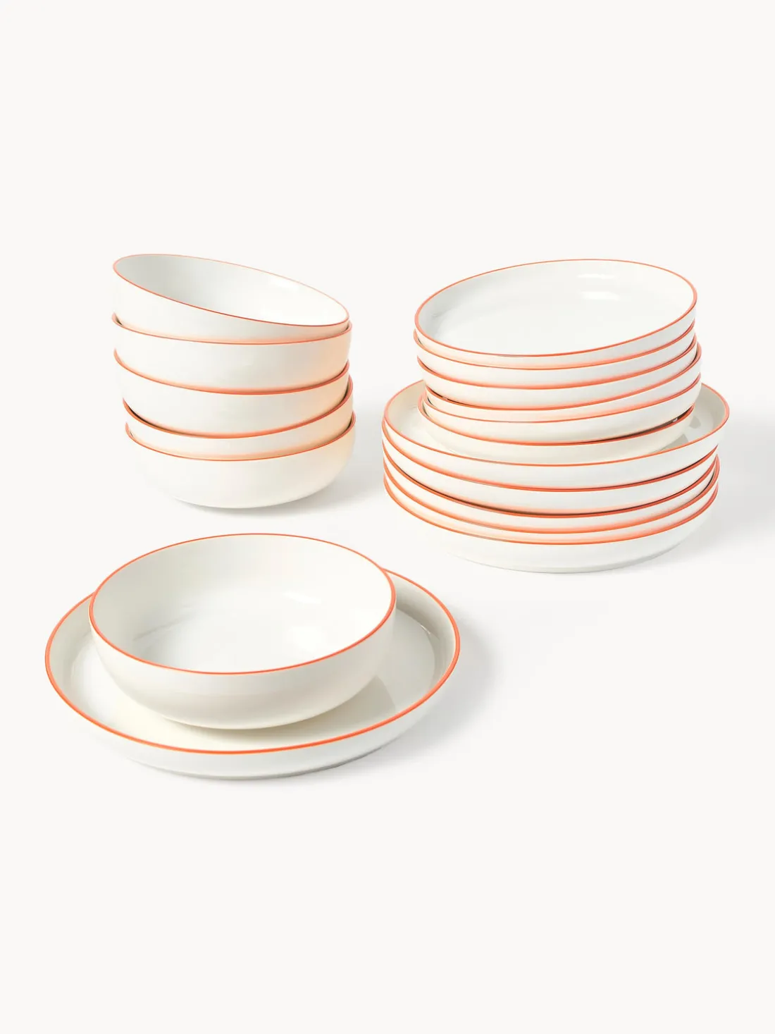Esta vajilla de 18 piezas con borde naranja se compone de seis platos llanos, seis platos hondos y seis platos postre.