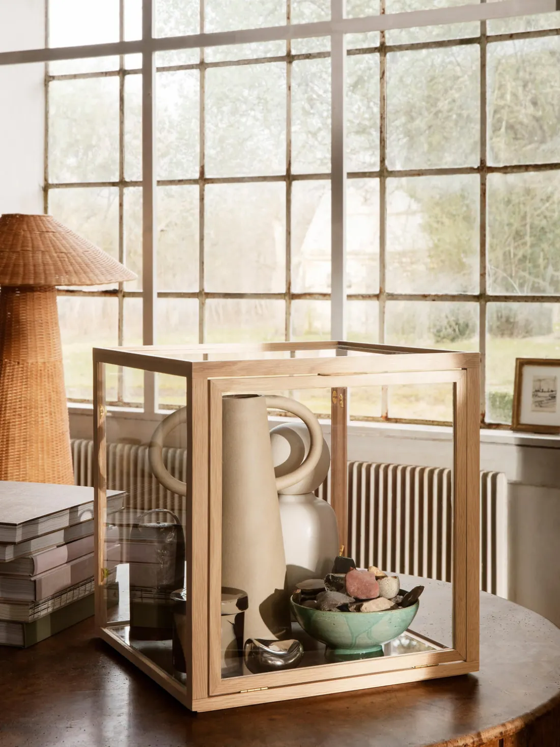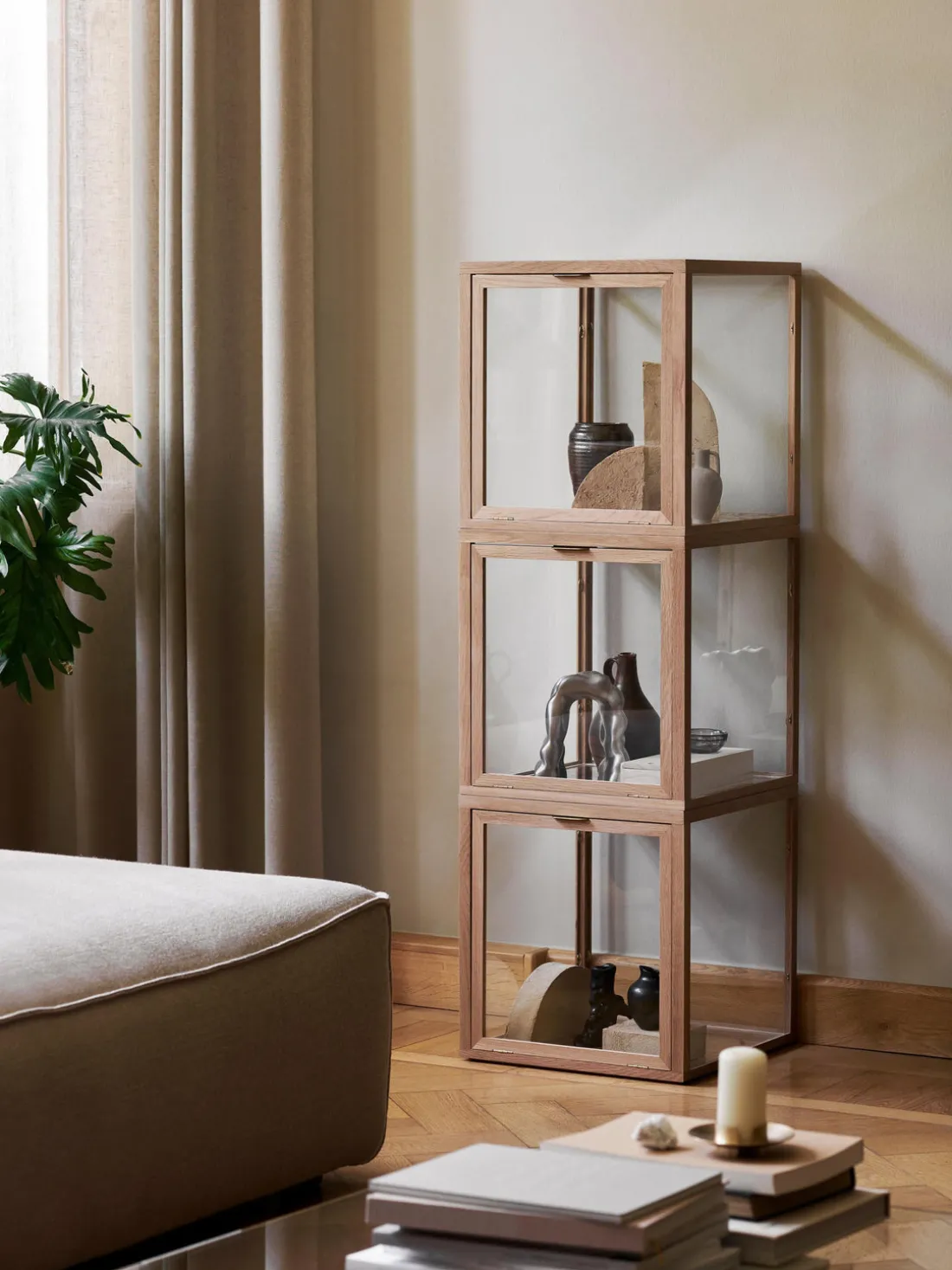 En las vitrinas Miru podrás guardar y exponer tus objetos favoritos, ya sean libros, jarrones, reliquias familiares u otros objetos preciados. Las cajas decorativas y apilables con marcos de roble añaden un toque artístico y original a tu interior. Puedes utilizarlas individualmente o combinarlas con otras cajas para presentar tus objetos favoritos de forma decorativa.