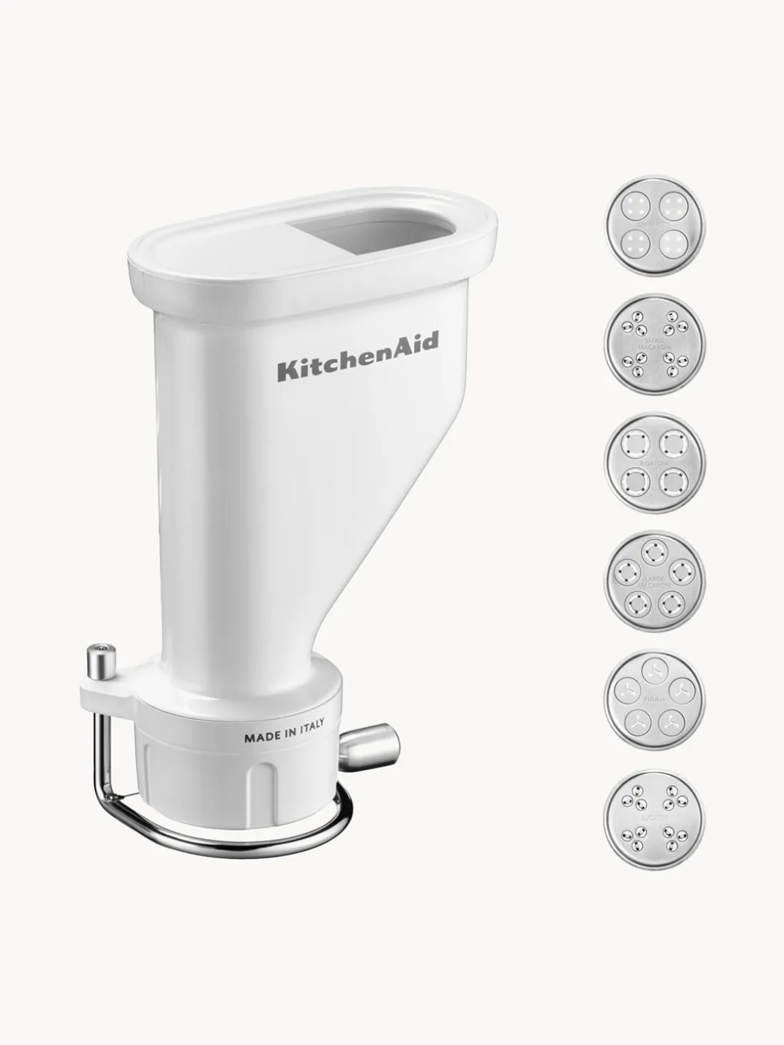 Este accesorio opcional se alimenta de tu batidora de pie KitchenAid a través del acoplador de accesorios. Te permite hacer espaguetis, bucatini, rigatoni, fusilli y macarrones grandes o pequeños caseros y frescos auténticos simplemente cambiando el accesorio para pasta. Una vez que hayas preparado la masa para la pasta con tu batidora de pie, puedes pasar a este accesorio. Simplemente introduce la masa en el accesorio y córtala con el cortador de pasta de alambre adjunto. Obtendrás resultados maravillosamente consistentes. Es tan divertido y casi como un juego de niños.