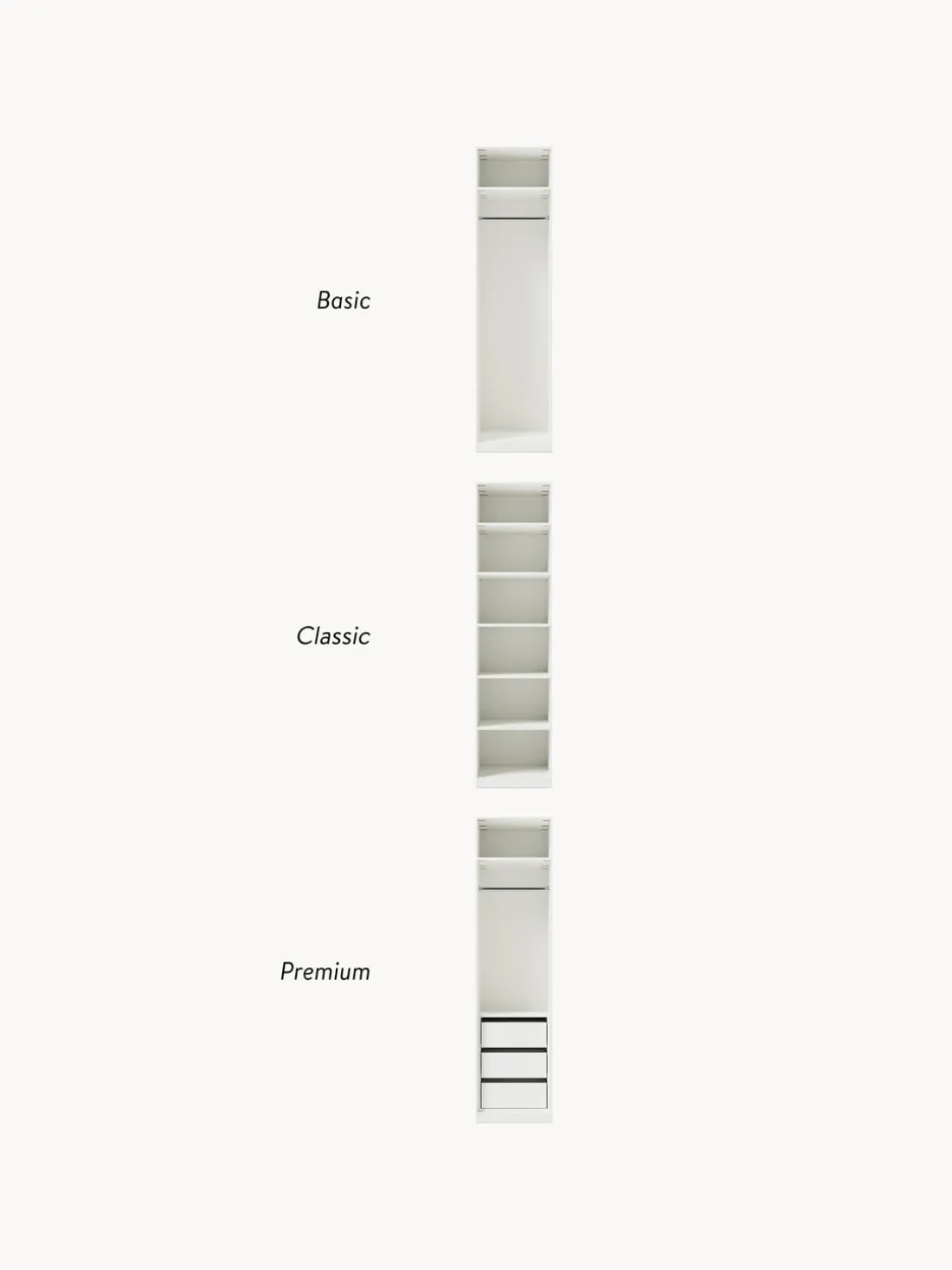 – Armario modular que consta de 1 módulo con diseño interior Basic que incluye 1 barra para colgar ropa y 1 estante