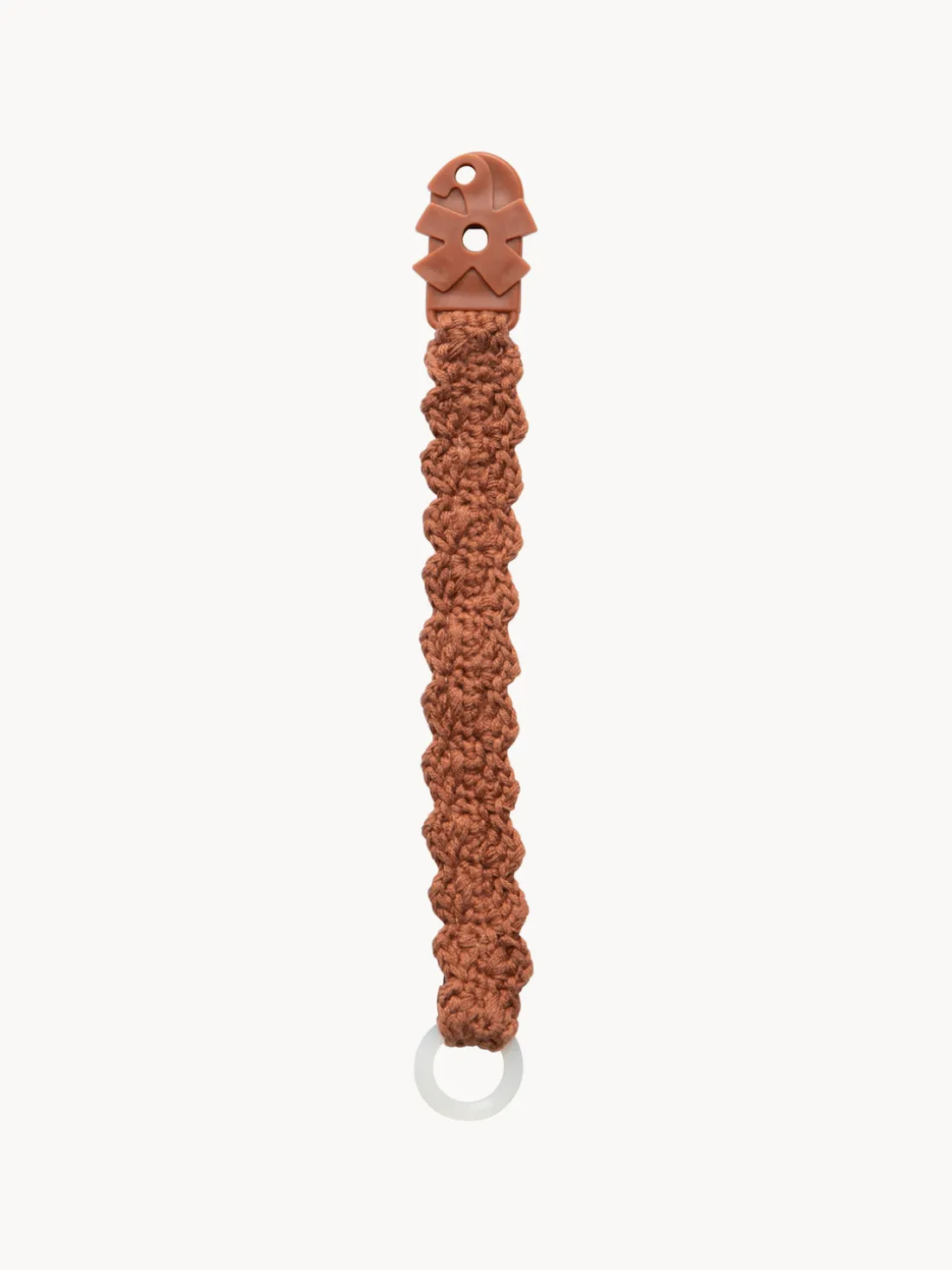 En un extremo de la cadena hay una anilla a la que se puede enganchar un chupete, y en el otro un clip que se sujeta fácilmente a la ropa del niño.