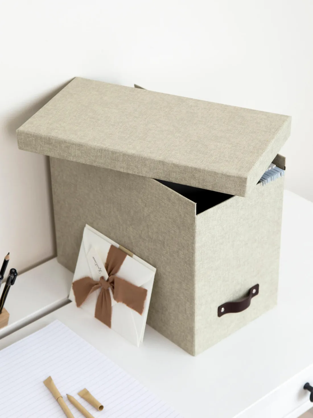 Caja organizadora con ocho separadores y tapadera extraíble para mantener orden en tu escritorio. Adecuada para el almacenamiento de documentos de formato DIN A4.