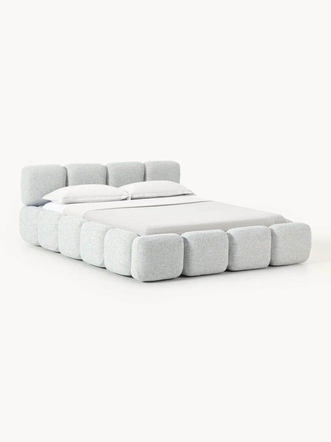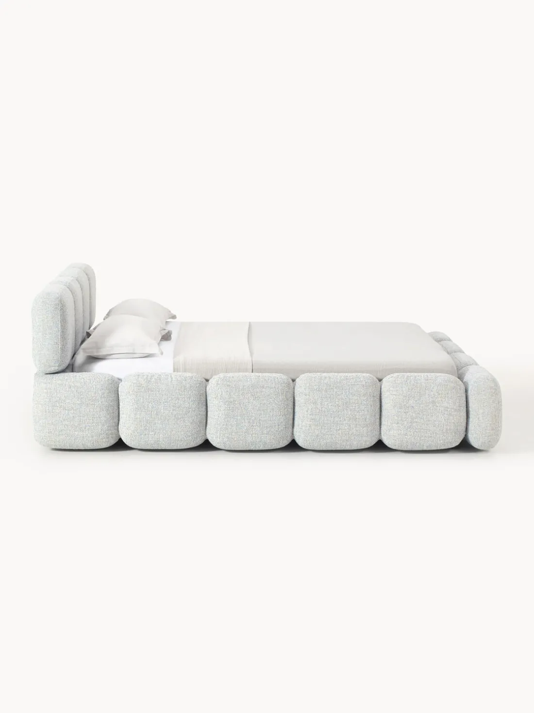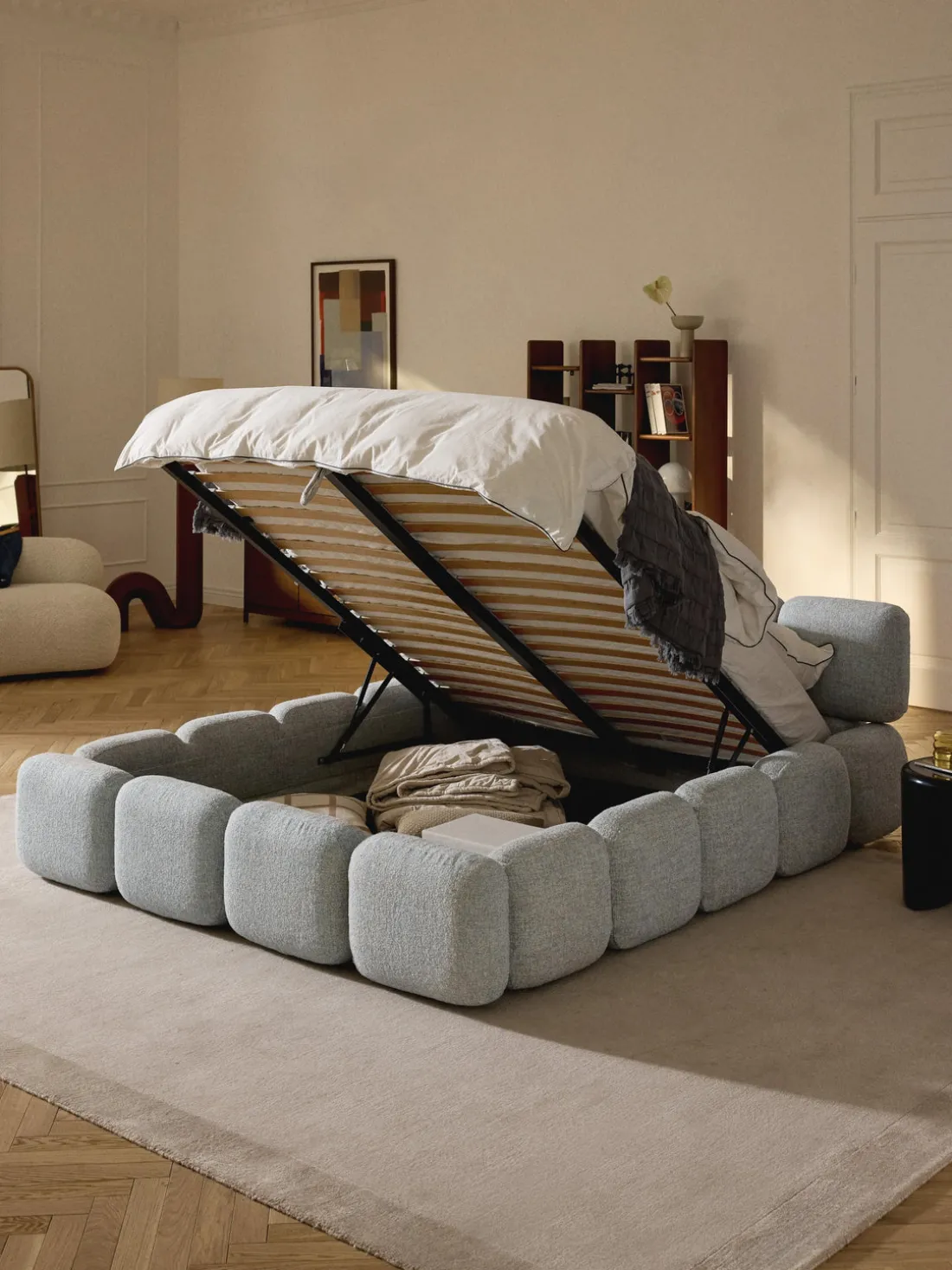 Cama tapizada con espacio de almacenamiento.