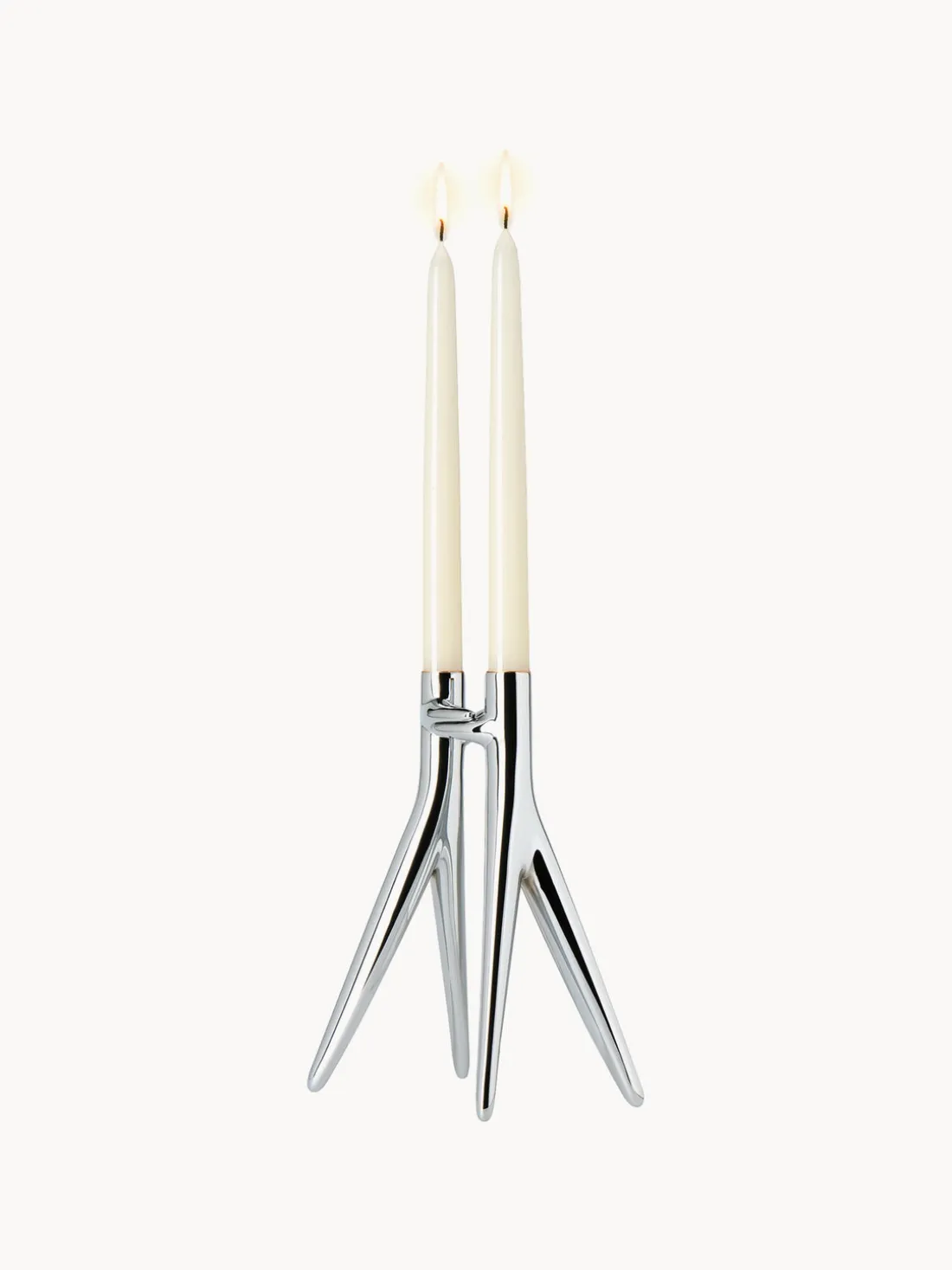 ABBRACCIAIO se compone de dos formas que, colocadas una frente a la otra, forman un amoroso abrazo. Las dos estructuras que forman el candelabro se entrelazan y dan estabilidad a la pieza.