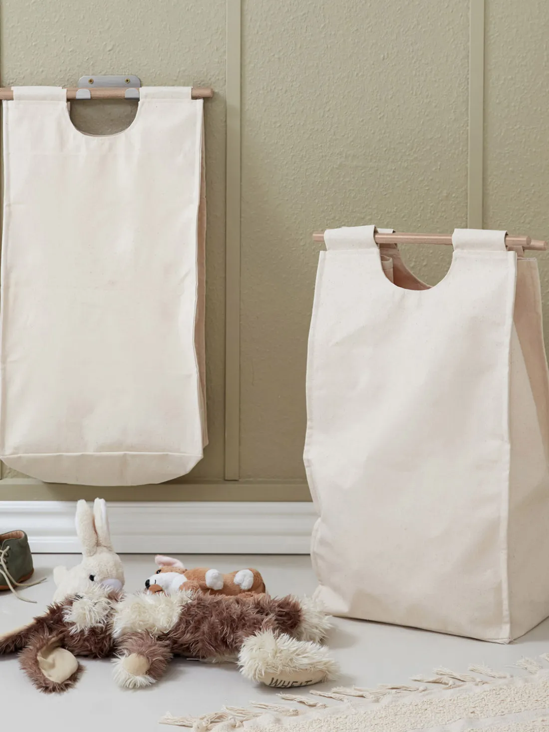Con la solución de almacenamiento de pared BAGUP, es fácil y elegante guardar y clasificar la ropa. El sistema consta de un elegante gancho de metal que se fija a la pared y de clavijas de roble que sujetan firmemente la bolsa textil al gancho. La combinación de metal, roble y textil crea un hermoso contraste entre los materiales y ofrece un aspecto sencillo y elegante. Esta versátil solución de almacenamiento es perfecta para clasificar la ropa, pero también puede utilizarse para guardar juguetes, botellas de reciclaje u otros objetos pequeños. Es ideal para el pasillo, la cocina, el baño o la habitación de los niños, donde combina funcionalidad y estética.