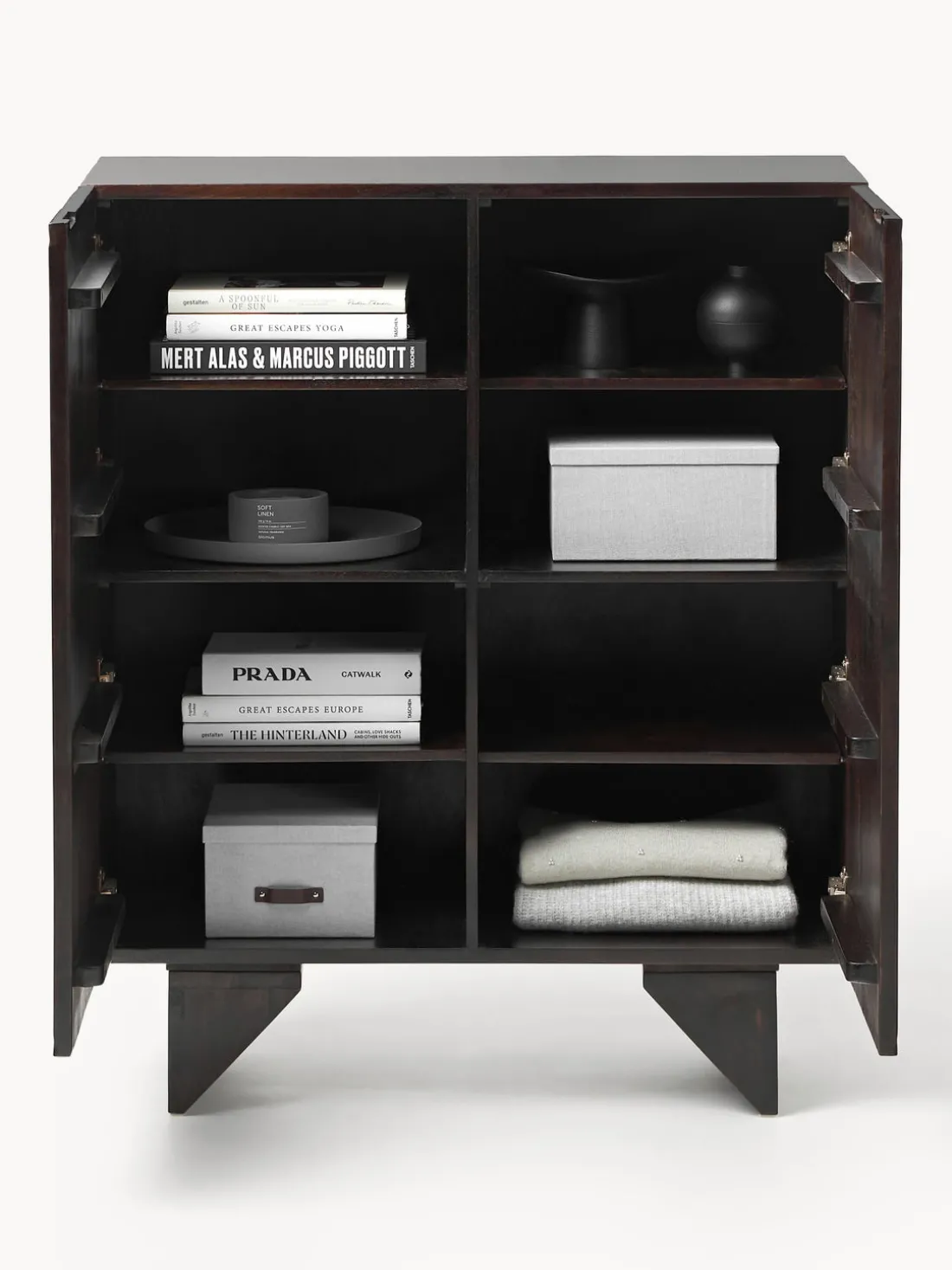Este chiffonnier tiene dos puertas y ocho compartimentos.