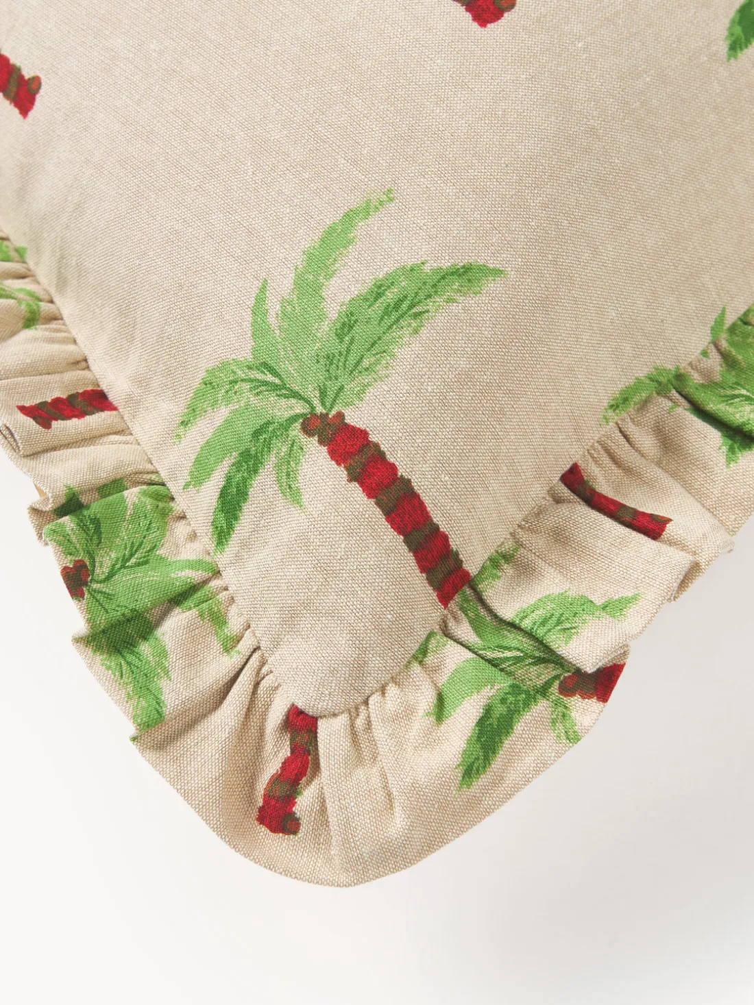 El cojín LES PALMIERS con estampado de palmeras tropicales y un elegante borde con volantes aportará un toque vacacional a tu hogar.
