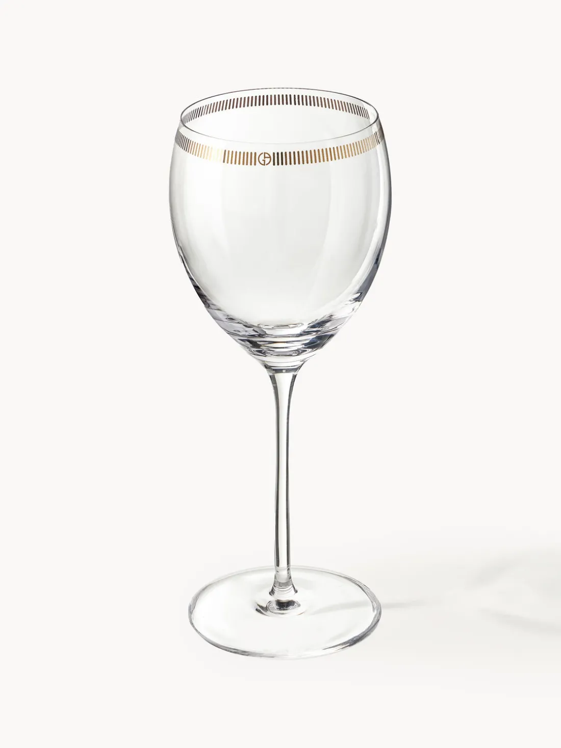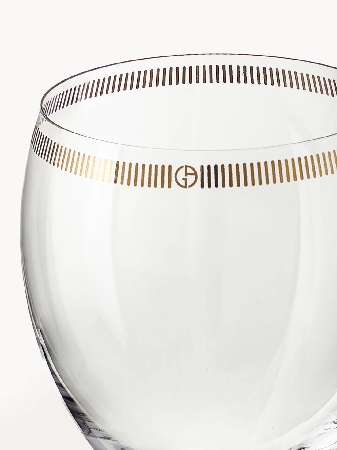 Juego de copas de cristal con adornos en oro de 18k y estampado de líneas quebradas irregulares verticales. Logotipo de Armani/Casa molido en la parte inferior de cada vaso.