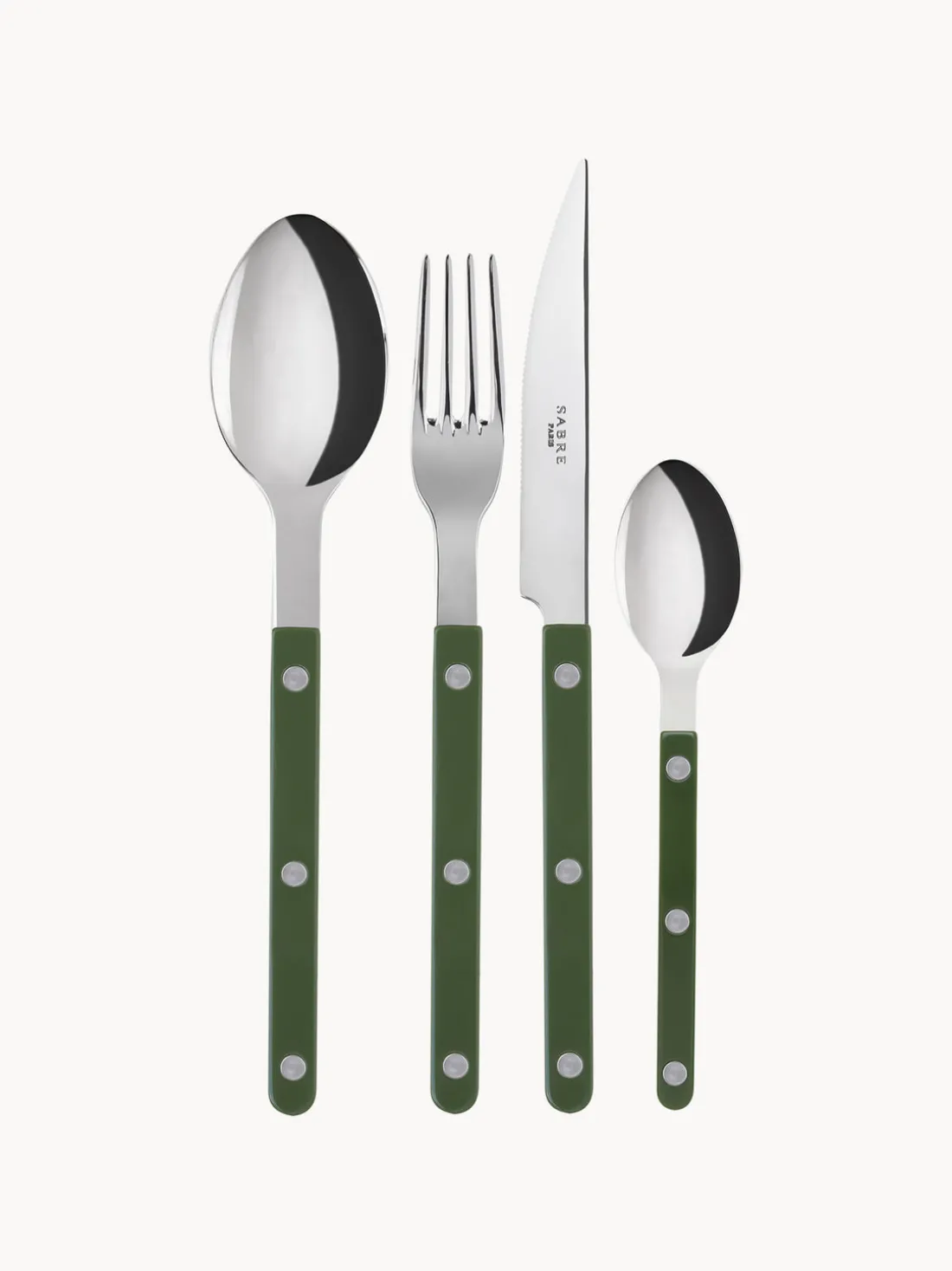 Cubertería de 4 piezas con superficie muy pulida que incluye 1 tenedor, 1 cuchillo, 1 cuchara y 1 cucharilla.