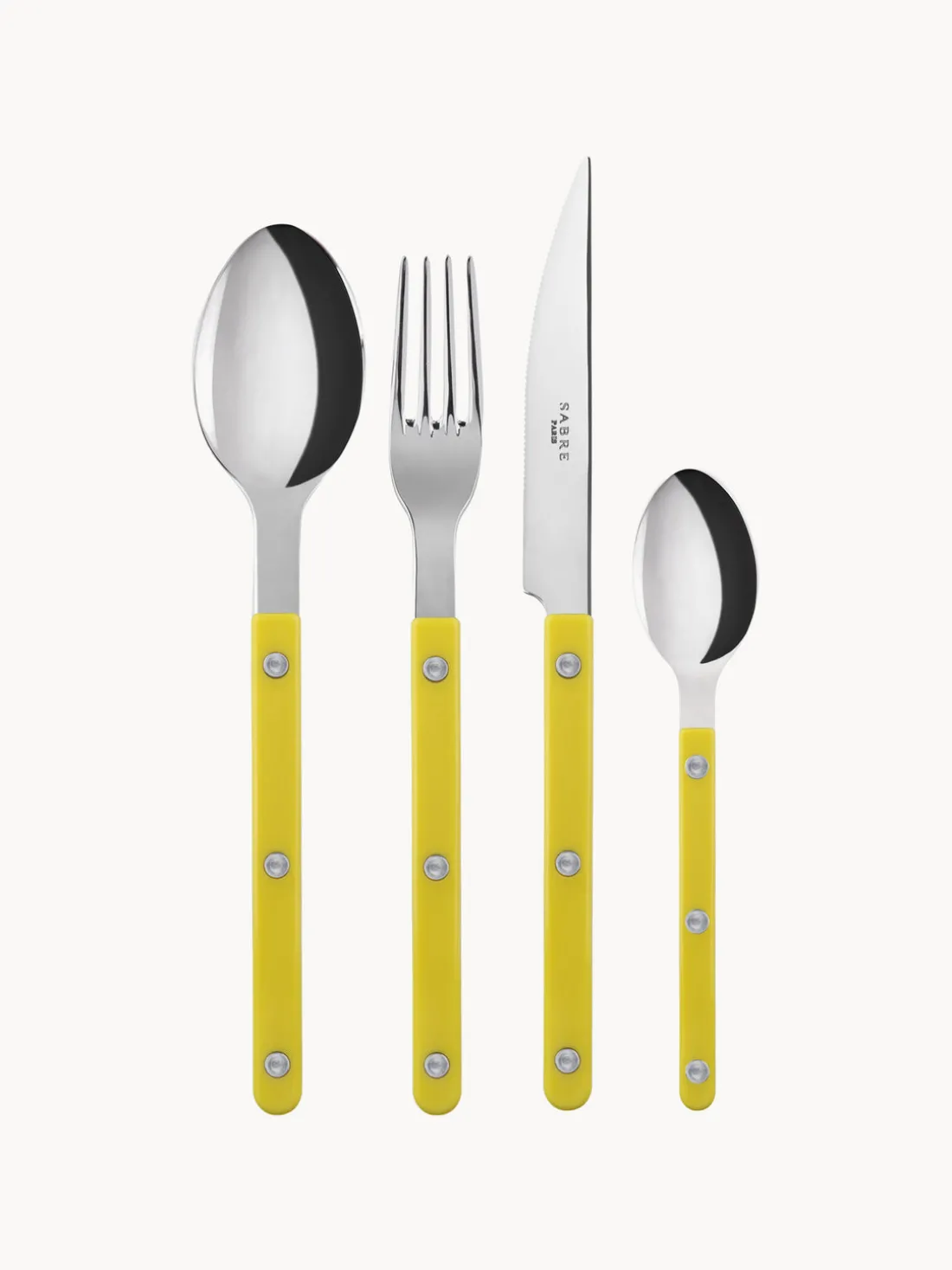 Cubertería de 4 piezas con superficie muy pulida que incluye 1 tenedor, 1 cuchillo, 1 cuchara y 1 cucharilla.