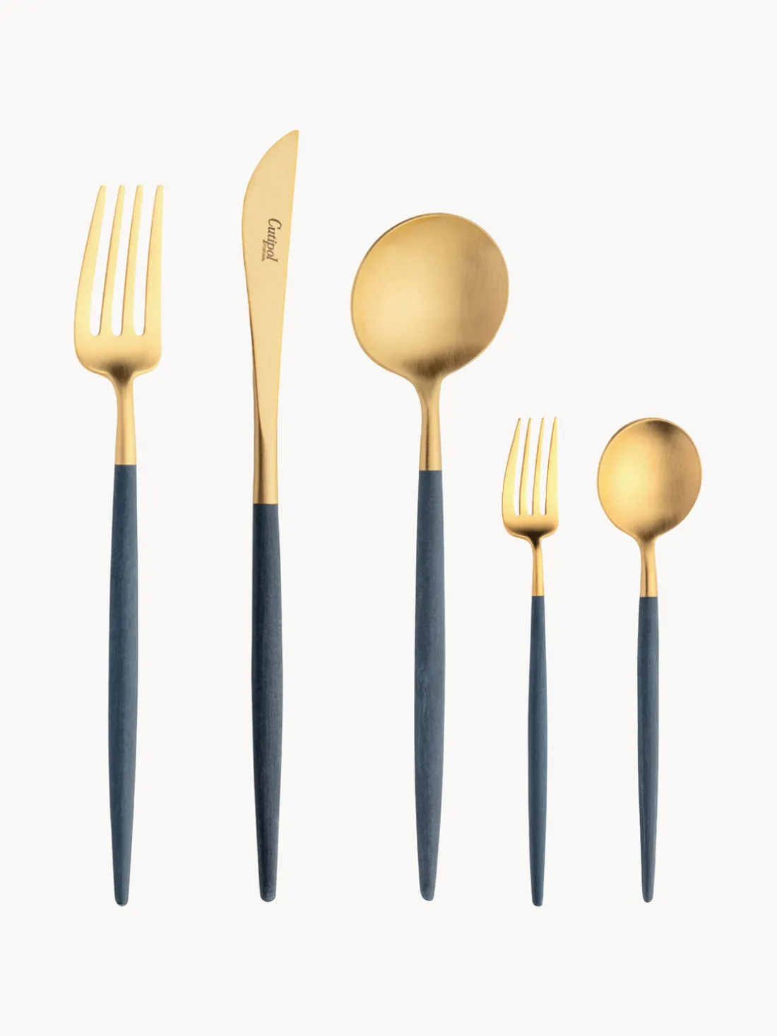 Cubertería de 5 piezas hecha a mano que incluye un tenedor de mesa, un cuchillo de mesa, una cuchara de mesa, un tenedor de postre y una cuchara de postre.