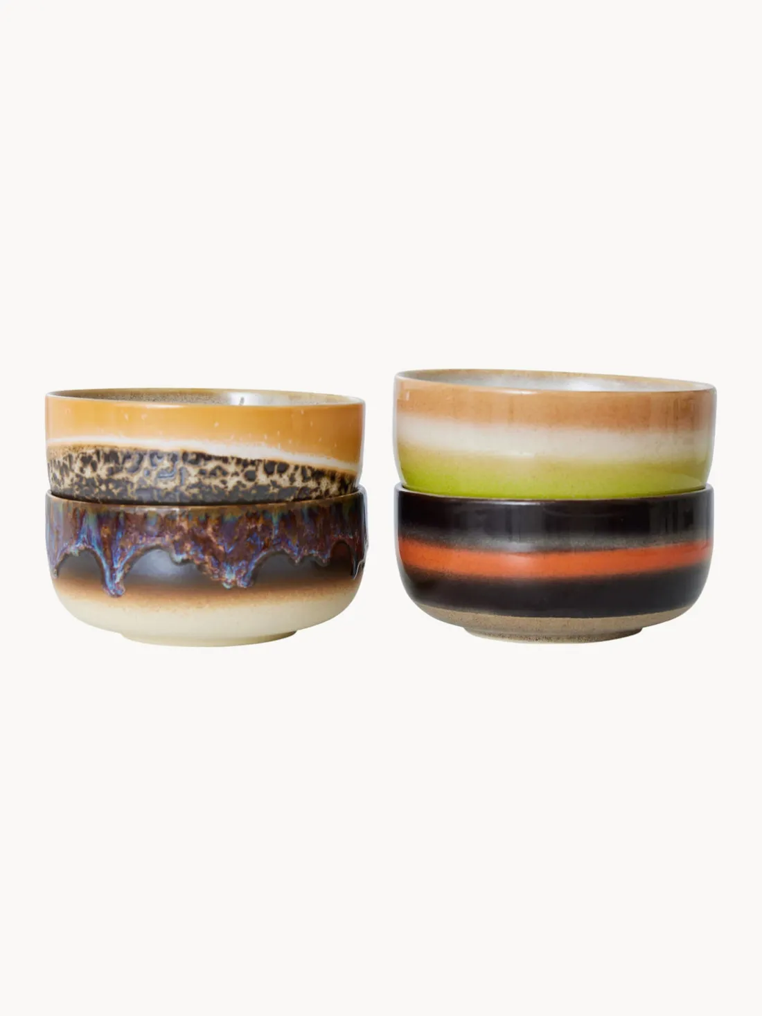 Puede que la colección de los 70’s esté inspirada en los emocionantes años 70, pero esta vez el acabado tiene una base natural y recuerda a las rugosas líneas costeras. La colección combina formas icónicas con adiciones frescas y atraerá a todos aquellos que aprecian la simplicidad en estado puro. El tamaño perfecto para tu desayuno con yogur, un sabroso bol de aperitivos o una pequeña guarnición. Los cuencos pueden utilizarse en cualquier sitio y, afortunadamente, vienen en un juego de cuatro diseños diferentes.