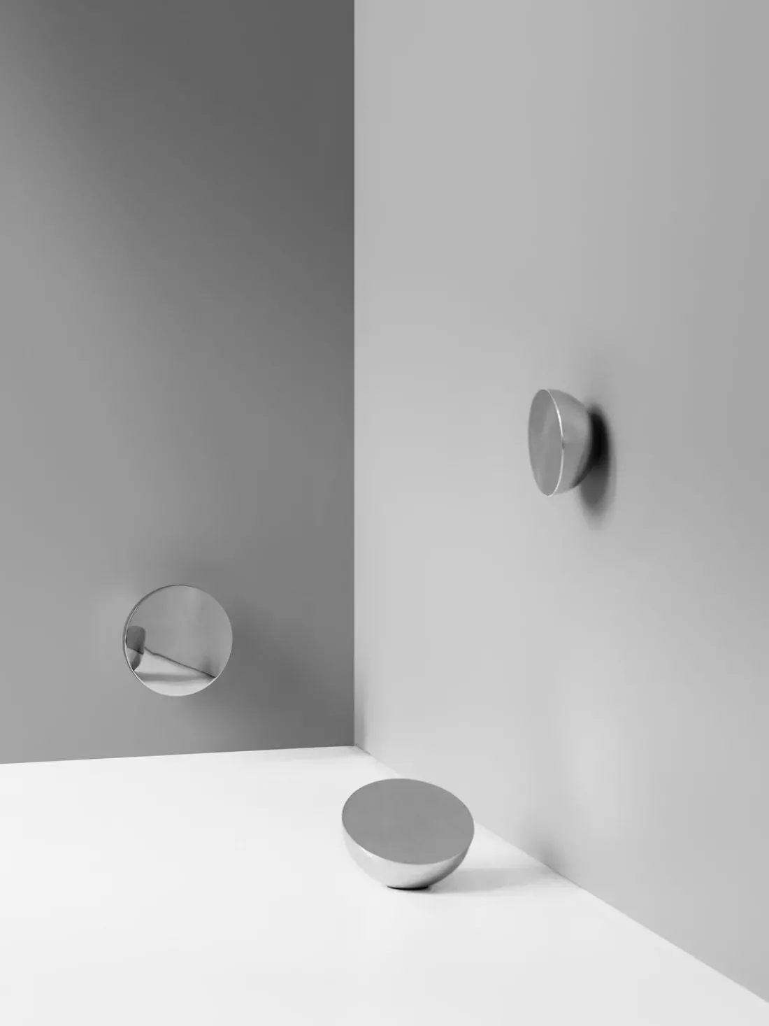 La poderosa materialidad del espejo AURA le confiere su resplandor interior único. Su superficie metálica pulida capta la luz ambiental y crea fascinantes reflejos gracias al juego entre superficies duras y planas y curvas suaves y largas. Diseñado para ser tocado y sostenido, el espejo combina peso y resistencia con la suavidad de su brillo y forma escultórica.