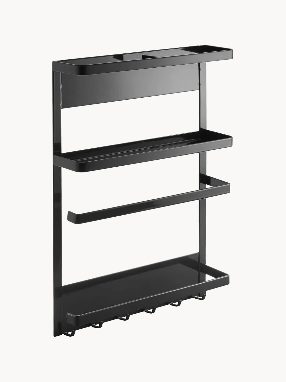 El estante lateral es ideal para utensilios de cocina como toallas de papel, papel para hornear o film transparente. Cucharas, cucharones y otros utensilios se pueden colgar en la barra de gancho.